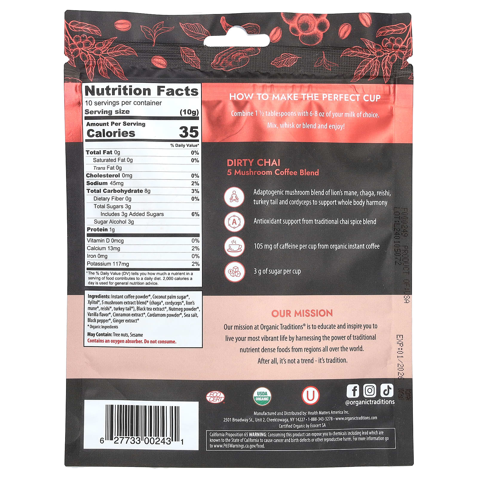 Порошок из растворимого кофе*, кокосовый сахар*, ксилитол*, Смесь 5 грибов* (чага*, кордицепс*, ежовик гребенчатый*, рейши*, трутовик разноцветный*), экстракт черного чая*, порошок из мускатного ореха*, ароматизатор «Ваниль»*, экстракт корицы*, порошок кардамона*, морская соль, черный перец*, экстракт имбиря*.