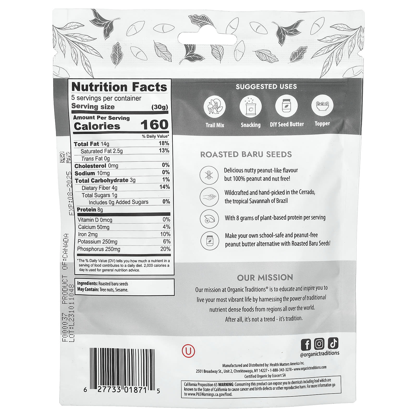 Семена бару - это бобовое растение, которое произрастает в Серрадо, огромной тропической саванне Бразилии и Боливии. Семена дико собирают с дерева Барузейро местные семейные кооперативы в экорегионе Бразилии. Natural Traditions Baru Seeds обладает восхитительным ореховым вкусом и уникально впечатляющим питательным профилем. Эти древние семена, богатые смесью питательных веществ, включая антиоксиданты, клетчатку, витамин Е и железо, веками питали коренные народы Серрадо. Бару также является исключительно высоким источником растительного белка, 24% его веса составляет белок с высоким уровнем усвояемости. Натуральные традиции Семена Бару медленно обжариваются без использования масел и консервантов, которые способствуют пищеварению и усиливают их впечатляющий ореховый вкус. Семена бару на 100% не содержат арахиса, но их вкус напоминает арахисовый ароматический профиль.
