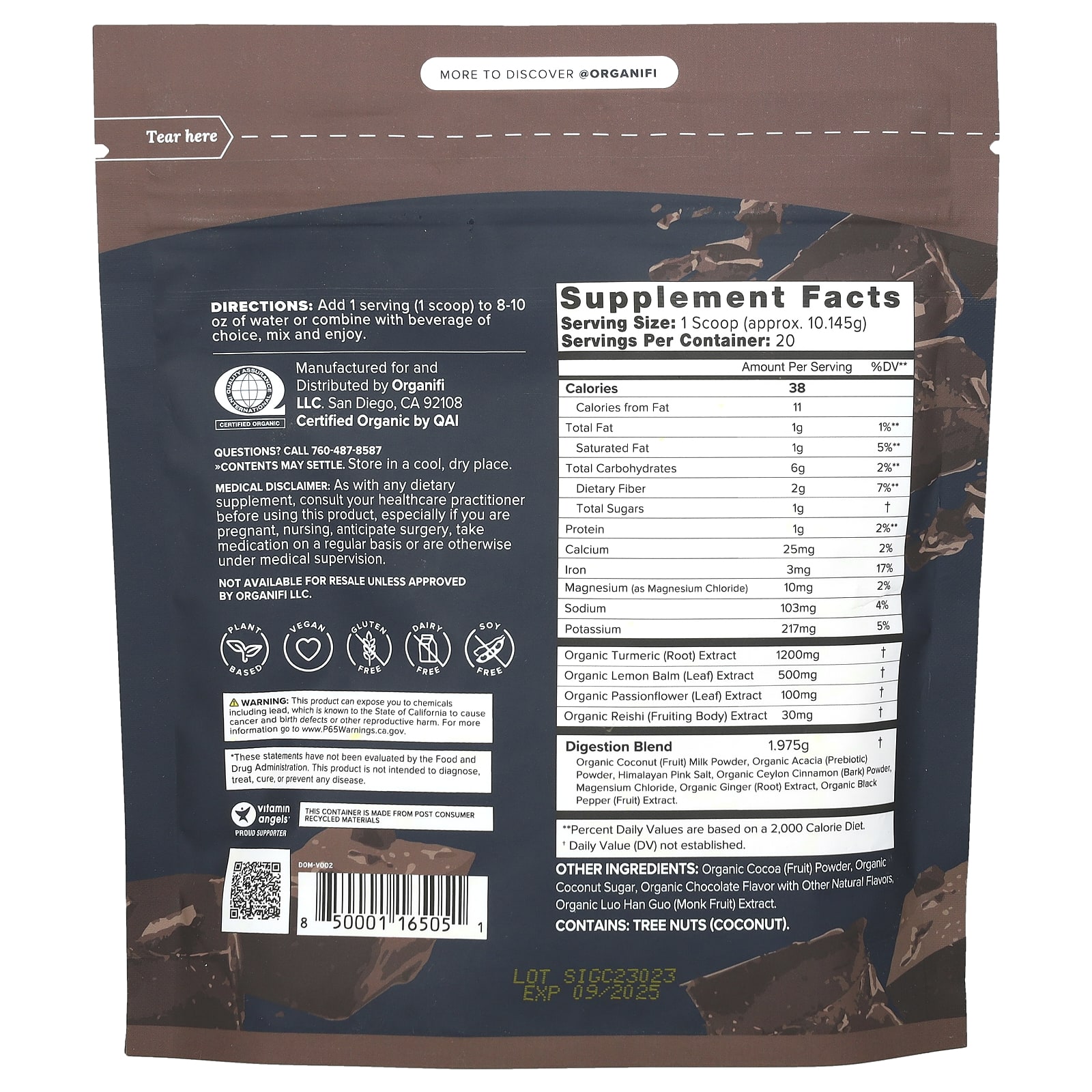 Органический какао-порошок (плоды), органический кокосовый сахар, органический шоколадный ароматизатор с другими натуральными ароматизаторами, экстракт органического архата (Monk fruit).
