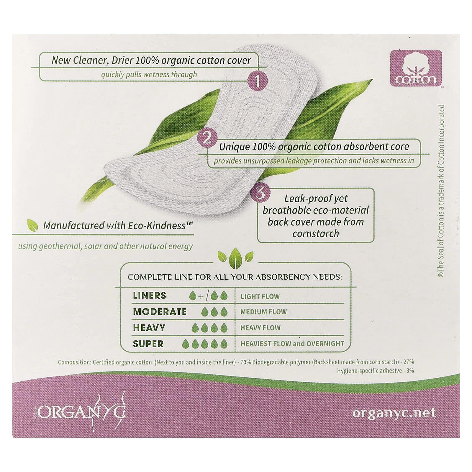 Состав: Сертифицированный органический хлопок (рядом с подкладкой и внутри нее) — 70% биоразлагаемого полимера (нижний слой изготовлен из кукурузного крахмала) — 27% Гигиенический клей — 3%.
