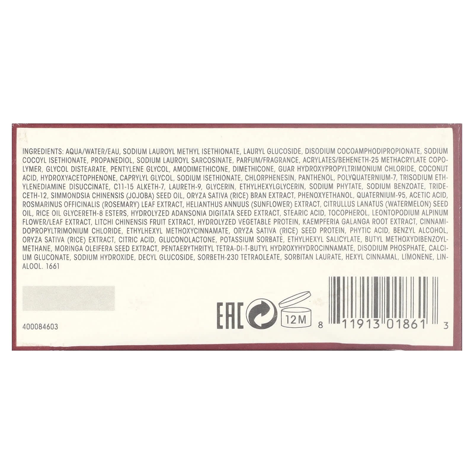 Вода, натрия лауроил метил изетионат, лаурил глюкозид, динатрия кокоамфодипропионат, кокоил изетионат натрия, пропандиол, лауроилсаркозинат натрия, парфюмерная композиция/отдушка, сополимер акрилатов/бегенет-25 метакрилата, гликоль дистеарат, пентилен гликоль, амодиметикон, диметикон, гуар гидроксипропилтримония хлорид, кокосовая кислота, гидроксиацетофенон, каприлилгликоль, изетионат натрия, хлорфенезин, пантенол, поликватерниум-7, тринатрия этилендиамин дисукцинат, c11-15 алкет-7, лаурет-9, глицерин, этилгексилглицерин, фитат натрия, бензоат натрия, тридецет-12, масло из семян жожоба (Simmondsia chinensis), экстракт рисовых отрубей (Oryza sativa), феноксиэтанол, кватерний-95, уксусная кислота, экстракт листьев розмарина (Rosmarinus officinalis), экстракт подсолнечника (Helianthus annuus), масло из семян арбуза (Citrullus lanatus), рисовое масло, 8 эфиры глицерет-8, гидролизованный экстракт семян баобаба (Adansonia digitata), стеариновая кислота, токоферол, экстракт цветков/листьев эдельвейса альпийского (Leontopodium alpinum), экстракт плодов личи китайского (Limchi chinensis), гидролизированный растительный протеин, экстракт корня Кемпферии галанга (Kaempferia galanga), циннамидопропилтримония хлорид, этилгексил метоксициннамат, протеин из семян риса (Oryza sativa), фитиновая кислота, бензиловый спирт, экстракт риса (Oryza sativa), лимонная кислота, глюконолактон, сорбат калия, этилгексил салицилат, бутилметоксидибензоилметан, экстракт семян моринги (Moringa oleifera), пентаэритритил тетра-ди-трет-бутил гидроксигидроциннамат, динатрия фосфат, глюконат кальция, гидроксид натрия, децил глюкозид, сорбет-230 тетраолеат, сорбитан лаурат, гексил циннамал, лимонен, линалоола.