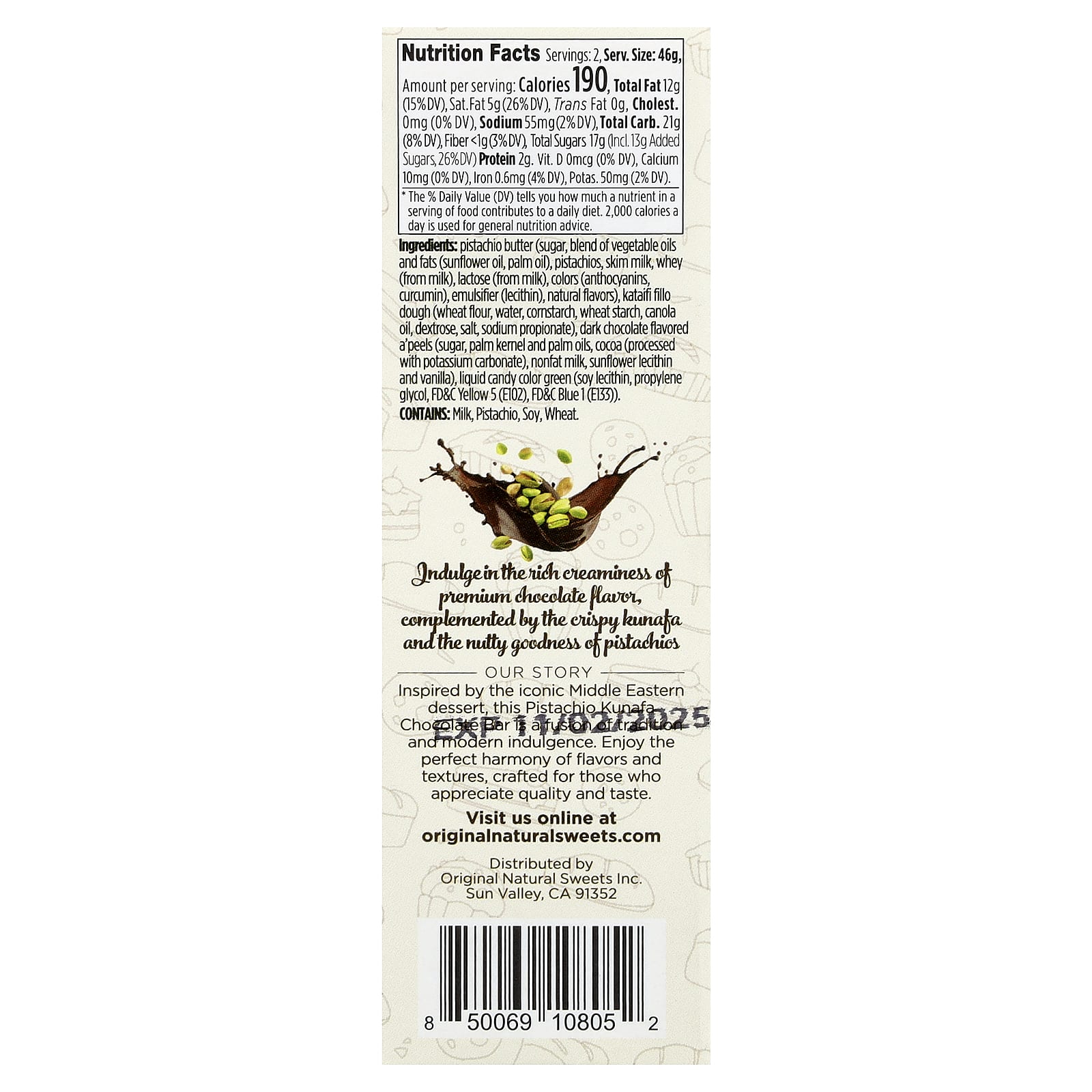 Наслаждайтесь насыщенным сливочным вкусом шоколада премиального качества, который дополняет хрустящая кунафа и ореховый вкус фисташек.