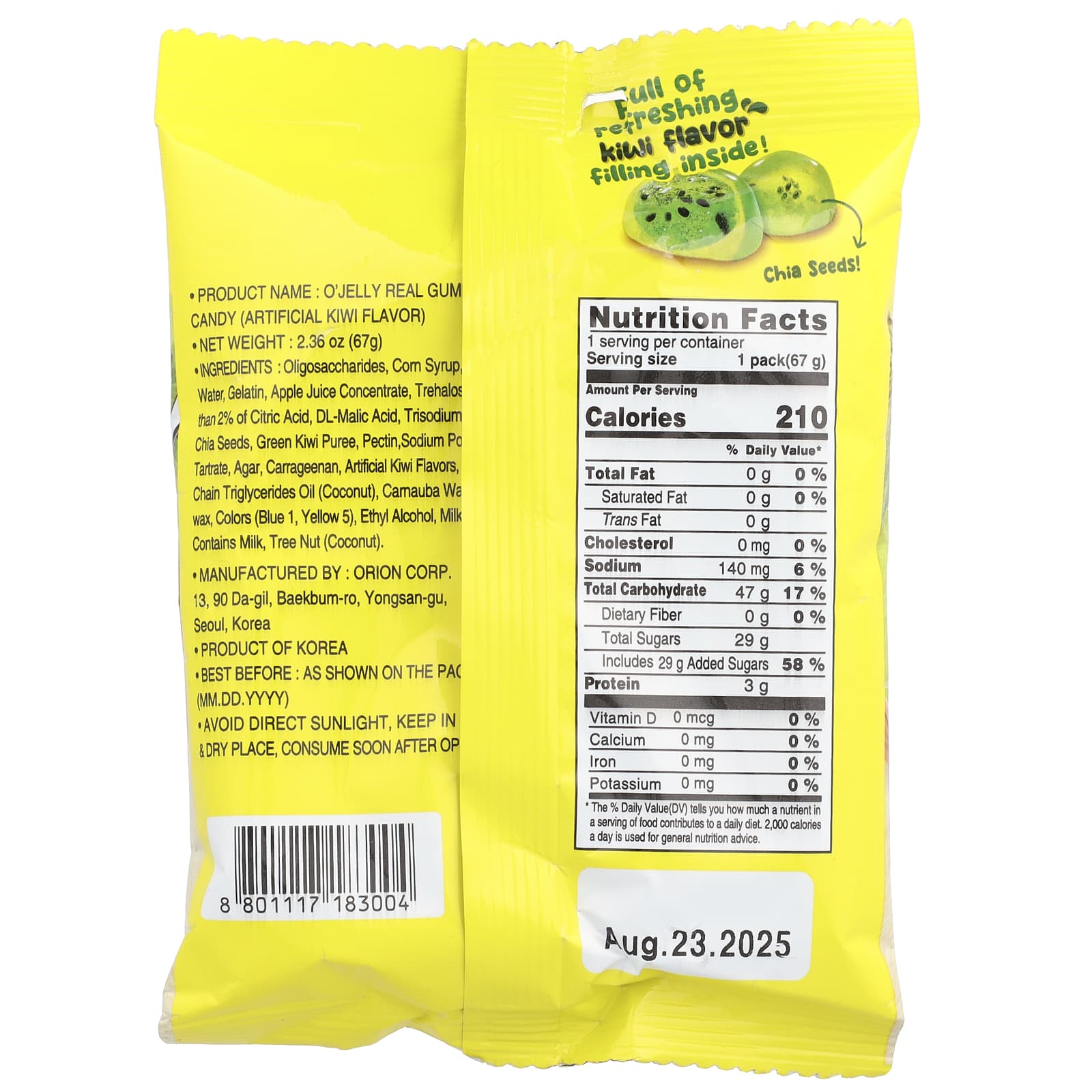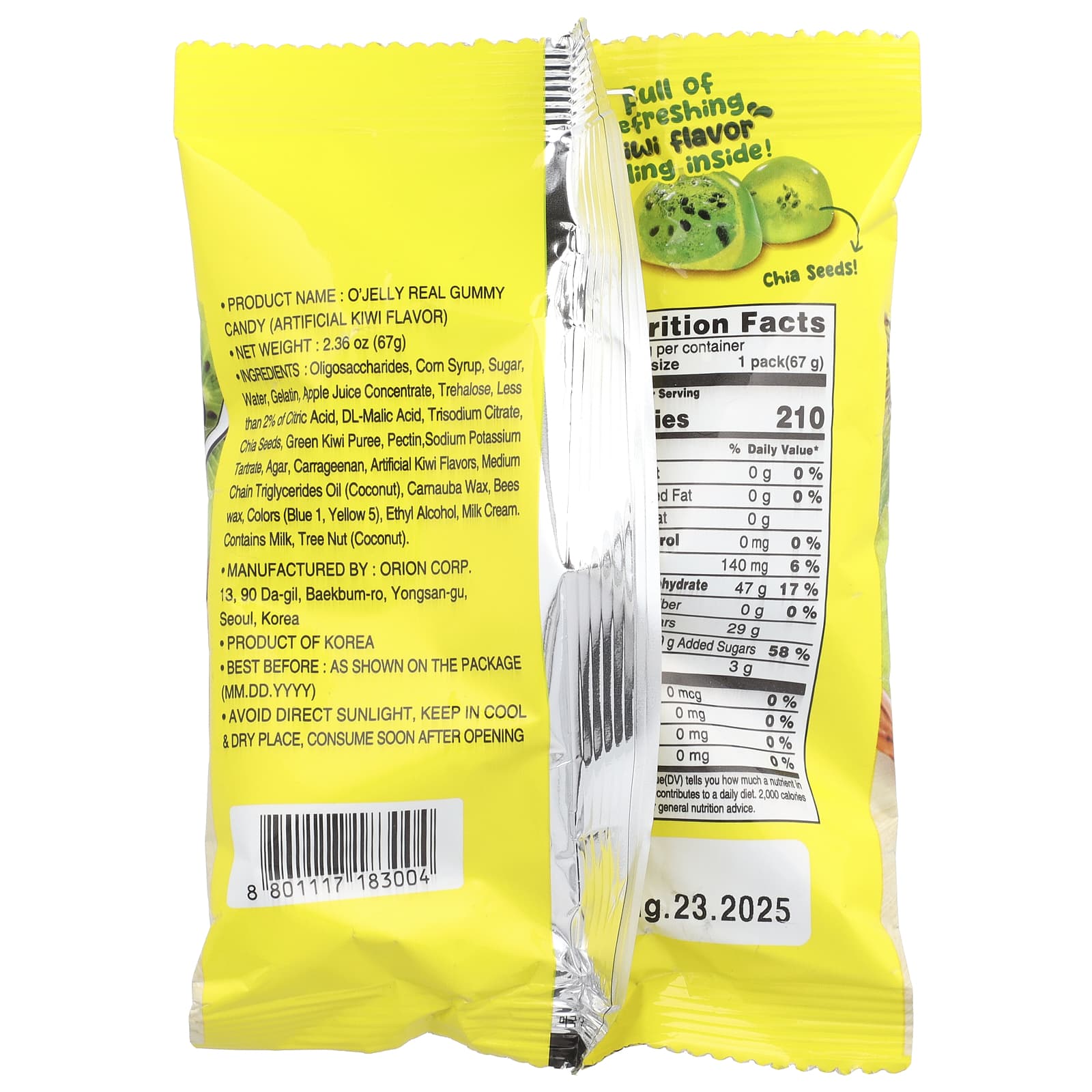 Олигосахариды, кукурузный сироп, сахара, вода, желатина, концентрат яблочного сока, трегалоза, менее 2% лимонной кислоты, дл яблочной кислоты, тринатриевый цитрат, семена чиа, пюре из зеленого киви, пектин, тартрат натрия и калия, агар, каррагинан, искусственные ароматизаторы киви, масло среднецепочечных триглицеридов (кокос), камаубский воск, пчелиный воск, цвета (синий 1, желтый 5), этиловый спирт, молочный крем.