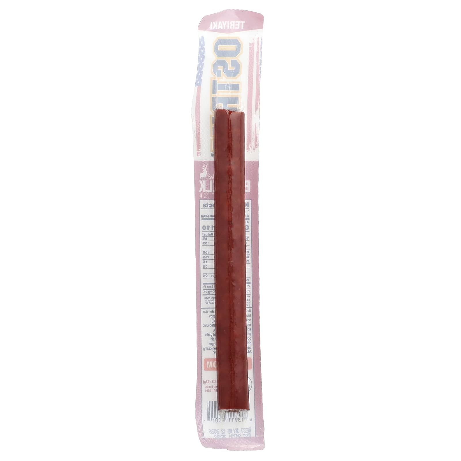 Говядина, лось, вода, рисовые отруби, обезвоженный соевый соус (соевый соус, [пшеница, бобы сои, соль] мальтодекстрин, соль), инкапсулированная лимонная кислота, соль, порошок из сока сельдерея, хлорид калия, порошок из лука и чеснока, гидролизованный кукурузный белок, обезвоженный обжаренный чеснок, имбирь, сахар, апельсиновое масло, в коллагеновой оболочке.