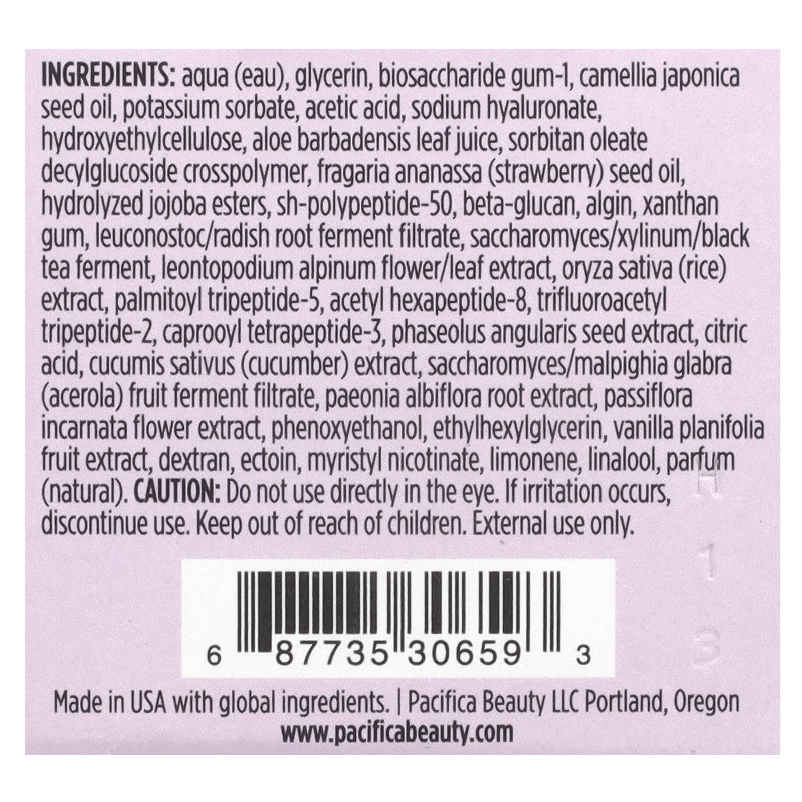 Вода (Aqua, eau), глицерин, биосахаридная смола-1, масло из семян камелии японской (Camellia japonica), сорбат калия, уксусная кислота, гиалуронат натрия, гидроксиэтилцеллюлоза, сок из листьев алоэ вера (Aloe barbadensis), децилглюкозид сорбитанолеата кроссполимер, масло из семян клубники (Fragaria ananassa), гидролизованные эфиры жожоба, sh-полипептид-50, бета-глюкан, альгин, ксантановая камедь, лейконосток/ферментированный фильтрат корня редиса, фермент дрожжевых грибков сахаромицетов, бактерий Acetobacter xylinum и черного чая, экстракт цветков и листьев эдельвейса альпийского (Leontopodium alpinum), экстракт риса (Oryza sativa), пальмитоил трипептид-5, ацетил гексапептид-8, трифторацетил трипептид-2, капроилтетрапептид-3., экстракт зерен адзуки (Phaseolus angularis), лимонная кислота, экстракт огурца (Cucumis sativus), фильтрат фермента сахаромицетов/ацеролы (Malpighia glabra), экстракт корня пиона молочноцветкового (Paeonia albiflora), экстракт цветков пассифлоры (Passiflora incarnata), феноксиэтанол, этилгексилглицерин, экстракт ванили (Vanilla planifolia), декстран, эктоин, миристил никотинат, лимонена, линалоол, отдушка (натуральная).
