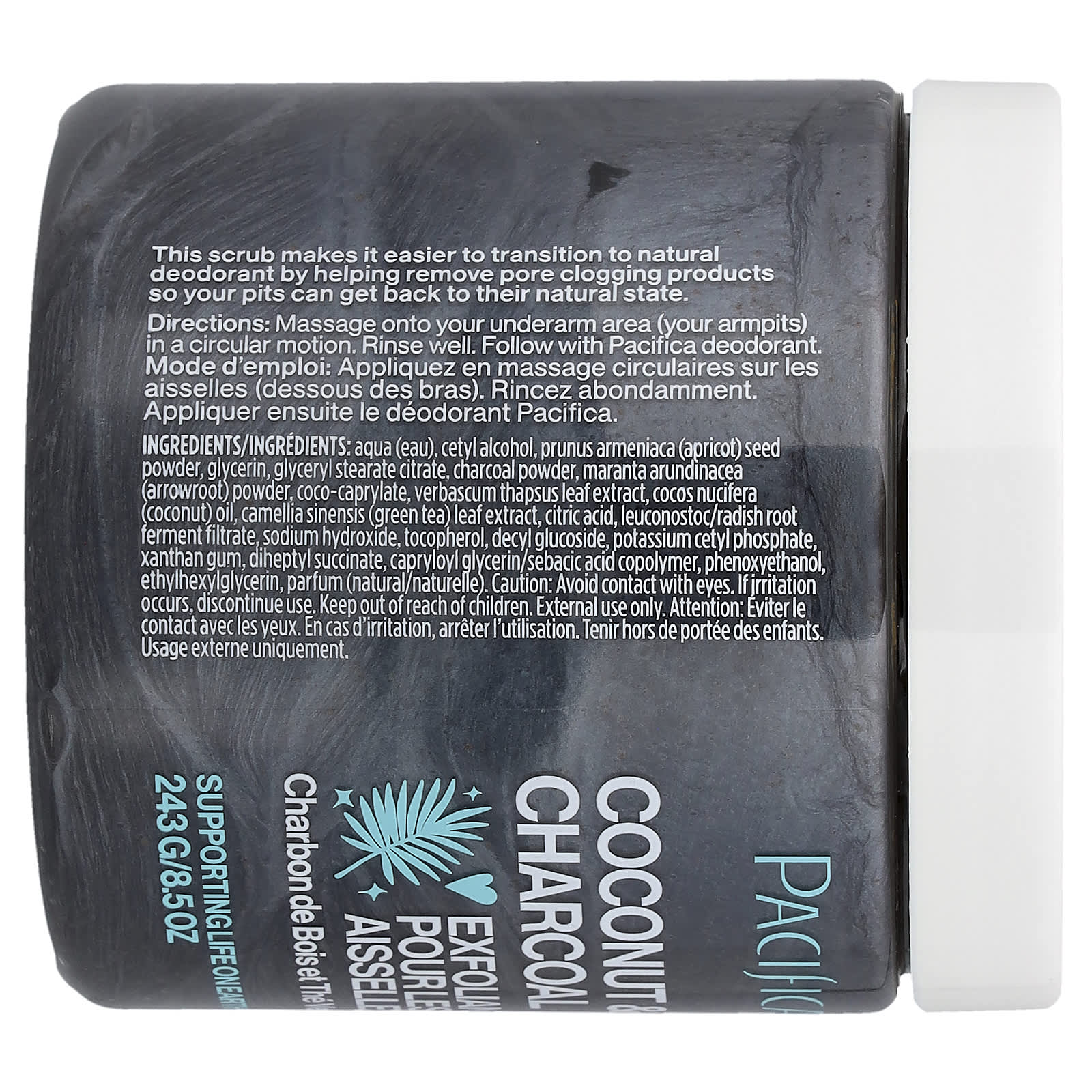 Вода, цетиловый спирт, порошок из семян абрикоса (Prunus armeniaca), глицерин, глицерил стеарат цитрат, порошок из древесного угля, порошок из аррорута маранты (Maranta arundinacea), кококаприлат, экстракт листьев вербаскума (Verbascum thapsus), кокосовое масло (Cocos nucifera), экстракт листьев зеленого чая (Camellia sinensis), лимонная кислота, лейконосток/ферментированный фильтрат корня редиса, гидроксид натрия, токоферол, децил глюкозид, цетил фосфат калия, ксантановая камедь, дигептил сукцинат, каприлоил глицерин/сополимер себациновой кислоты, феноксиэтанол, этилгексилглицерин, отдушка (натуральная).