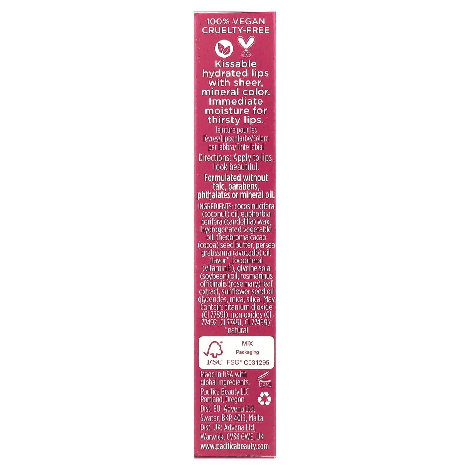 • Не содержит кармина, пчелиного воска, ланолина, фталатов, парабенов, минеральных масел, ГМО, триклозана, пропиленгликоля и нефти.