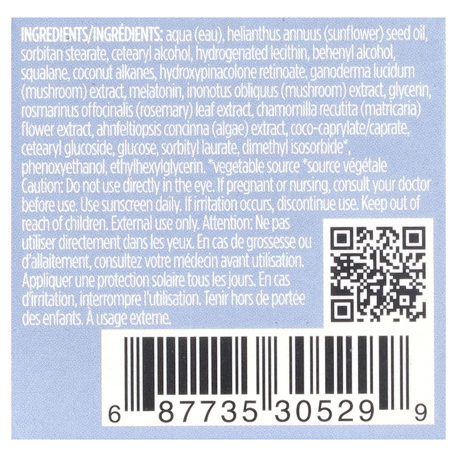 Вода (eau), масло семян подсолнечника (Helianthus annuus) сорбитан стеарат, цетеариловый спирт, гидрогенизированный лецитин, бегениловый спирт, сквалан, алканы из кокоса, гидроксипинаколон ретиноат, экстракт трутовика лакированного (Ganoderma lucidum), мелатонина, экстракт гриба чаги (Inonotus obliquus), глицерин, экстракт листьев розмарина (Rosmarinus officinalis), экстракт цветков ромашки лекарственной (Chamomilla recutita), экстракт водоросли анфельтиопсис концинна (Ahnfeltiopsis cocinna), коко-каприлат/капрат цетеарил глюкозид, глюкоза, сорбитил лаурат, диметил изосорбид*, феноксиэтанол, этилгексилглицерин.