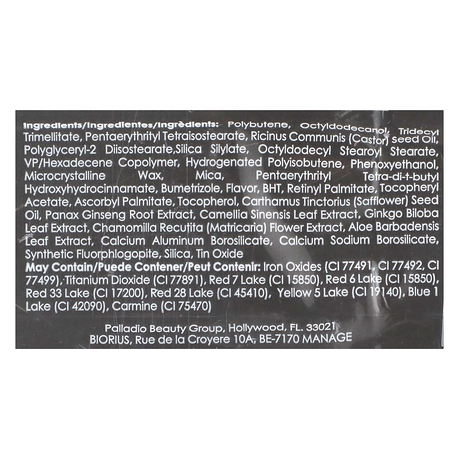 Каждый блеск для губ Palladio изготовлен из растительных ингредиентов, таких как зеленый чай, женьшень, ромашка, алоэ вера и гинкго билоба, и обогащен антиоксидантными витаминами A, C, D и E, чтобы увлажнить губы и придать губам идеальный вид.