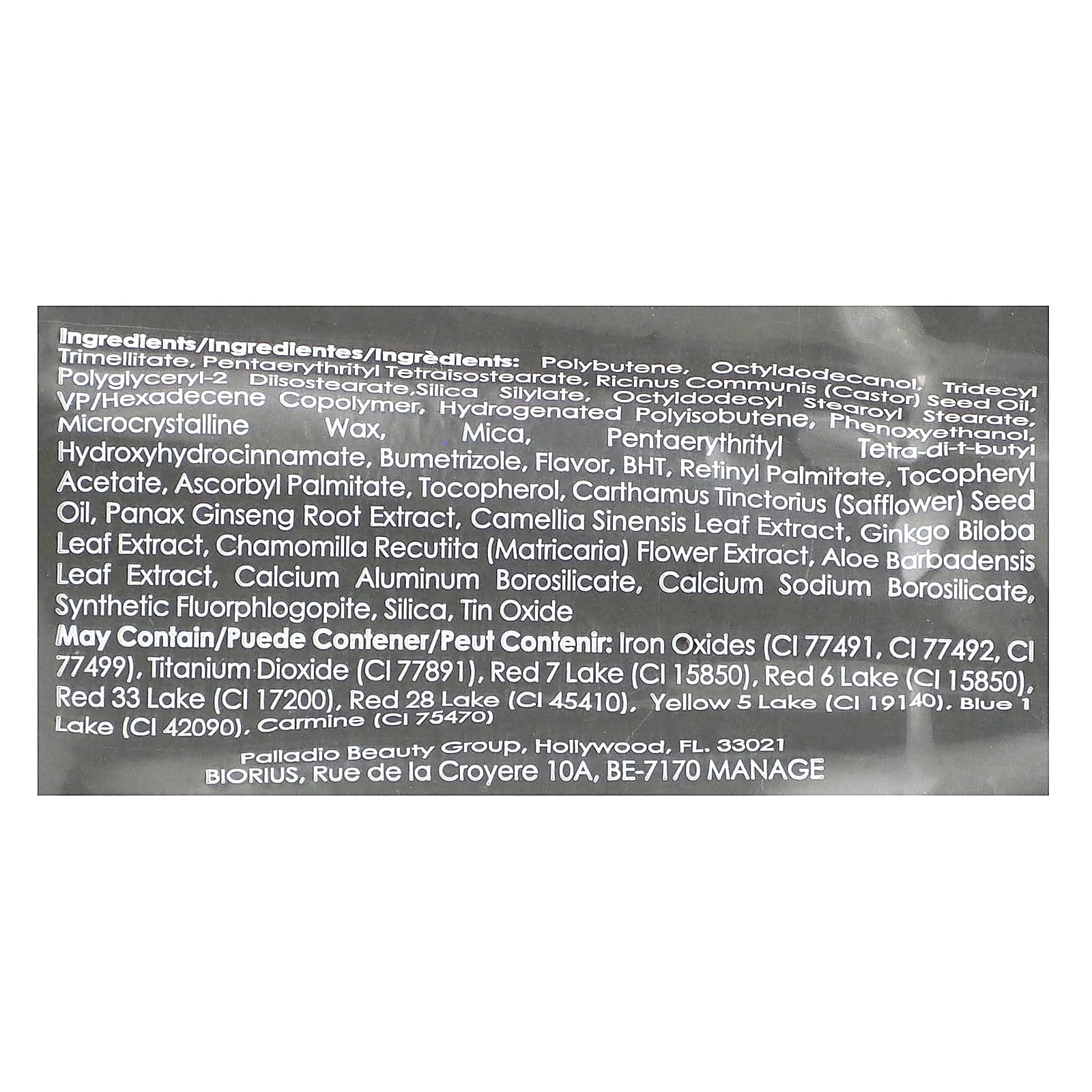 Полибутен, октилдодеканол. тридецил тримеллитат, пентаэритритил тетраизостеарат, касторовое масло (Ricinus communis), полиглицерил-2 диизостеарат, силилат диоксида кремния, тридецил октилдодецил стеароил стеарат, ВП/гексадецен сополимер, гидрогенизированный полиизобутен, феноксиэтанол, микрокристаллический воск, слюда, пентаэритритил тетра-ди-трет-бутил гидроксигидроциннамат, буметризол, ароматизатор, бутилгидрокситолуол, ретинилпальмитат, токоферилацетат, аскорбил пальмитат, токоферол, масло семян сафлора (Carthamus tinctorius), экстракт корня женьшеня (Panax ginseng), экстракт листьев зеленого чая (Camellia sinensis), экстракт листьев гинкго билоба (Ginkgo biloba), экстракт цветков ромашки лекарственной (Chamomilla recutita), экстракт листьев алоэ вера (Aloe barbadensis), кальций алюминий боросиликат, кальций натрий боросиликат, синтетический фторфлогопит, диоксид кремния, оксид олова