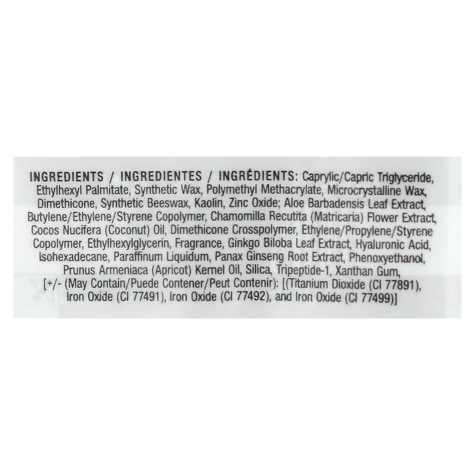 Каприловый/каприновый триглицерид, этилгексил пальмитат, синтетический воск, полиметилметакрилат, микрокристаллический воск, диметикон, синтетический воск, каолин, оксид цинка; экстракт листьев алоэ вера, сополимер бутилена/этилена/стирола, экстракт цветков ромашки лекарственной (Chamomilla recutita), кокосовое масло (Cocos nucifera), диметикон кроссполимер, сополимер этилена/пропилена/стирола, этилгексилглицерин, отдушка, экстракт листьев гинкго билоба (Ginkgo biloba), гиалуроновая кислота, изогексадекан, вазелиновое масло, экстракт корня женьшеня (Panax ginseng), феноксиэтанол, масло из косточек абрикоса (Prunus armeniaca), диоксид кремния, трипептид-1, ксантановая камедь, [+/- (может содержать диоксид титана (CI 77891), оксид железа (CI 77491), оксид железа (CI 77492), и оксид железа (CI 77499)]