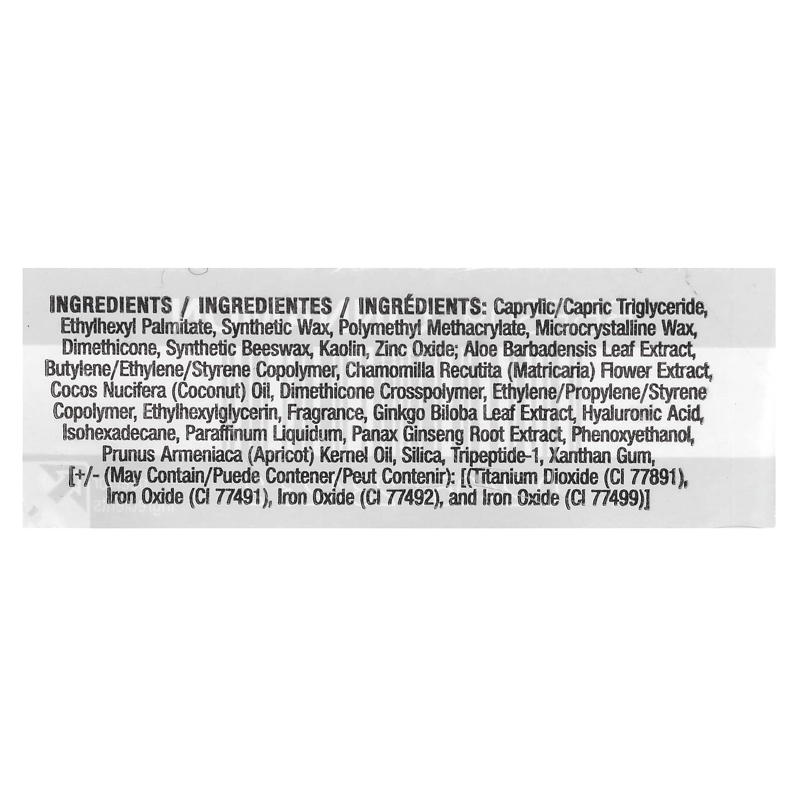 Каприловый/каприновый триглицерид, этилгексил пальмитат, синтетический воск, полиметилметакрилат, микрокристаллический воск, диметикон, синтетический воск, каолин, оксид цинка; экстракт листьев алоэ вера, сополимер бутилена/этилена/стирола, экстракт цветков ромашки лекарственной (Chamomilla recutita), кокосовое масло (Cocos nucifera), диметикон кроссполимер, сополимер этилена/пропилена/стирола, этилгексилглицерин, отдушка, экстракт листьев гинкго билоба (Ginkgo biloba), гиалуроновая кислота, изогексадекан, вазелиновое масло, экстракт корня женьшеня (Panax ginseng), феноксиэтанол, масло из косточек абрикоса (Prunus armeniaca), диоксид кремния, трипептид-1, ксантановая камедь, [+/- (может содержать / puede contener / peut contenir): [(диоксид титана (CI 77891), оксид железа (CI 77491), оксиды железа (CI 77492), оксид железа (CI 77499)].