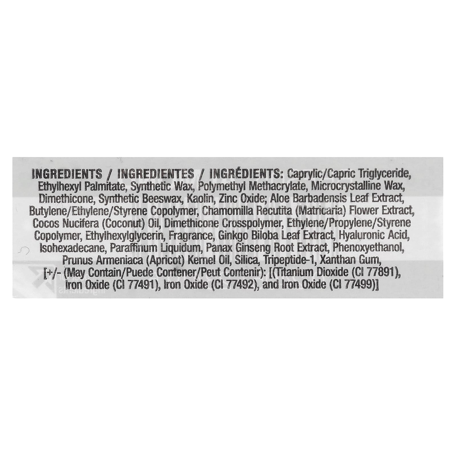 Каприловый/каприновый триглицерид, этилгексил пальмитат, синтетический воск, полиметилметакрилат, микрокристаллический воск, диметикон, синтетический воск, каолин, оксид цинка; экстракт листьев алоэ вера, сополимер бутилена/этилена/стирола, экстракт цветков ромашки лекарственной (Chamomilla recutita), кокосовое масло (Cocos nucifera), диметикон кроссполимер, сополимер этилена/пропилена/стирола, этилгексилглицерин, отдушка, экстракт листьев гинкго билоба (Ginkgo biloba), гиалуроновая кислота, изогексадекан, вазелиновое масло, экстракт корня женьшеня (Panax ginseng), феноксиэтанол, масло из косточек абрикоса (Prunus armeniaca), диоксид кремния, трипептид-1, ксантановая камедь, [+/- (может содержать / puede contener / peut contenir): [(диоксид титана (CI 77891), оксид железа (CI 77491), оксиды железа (CI 77492), оксид железа (CI 77499)].