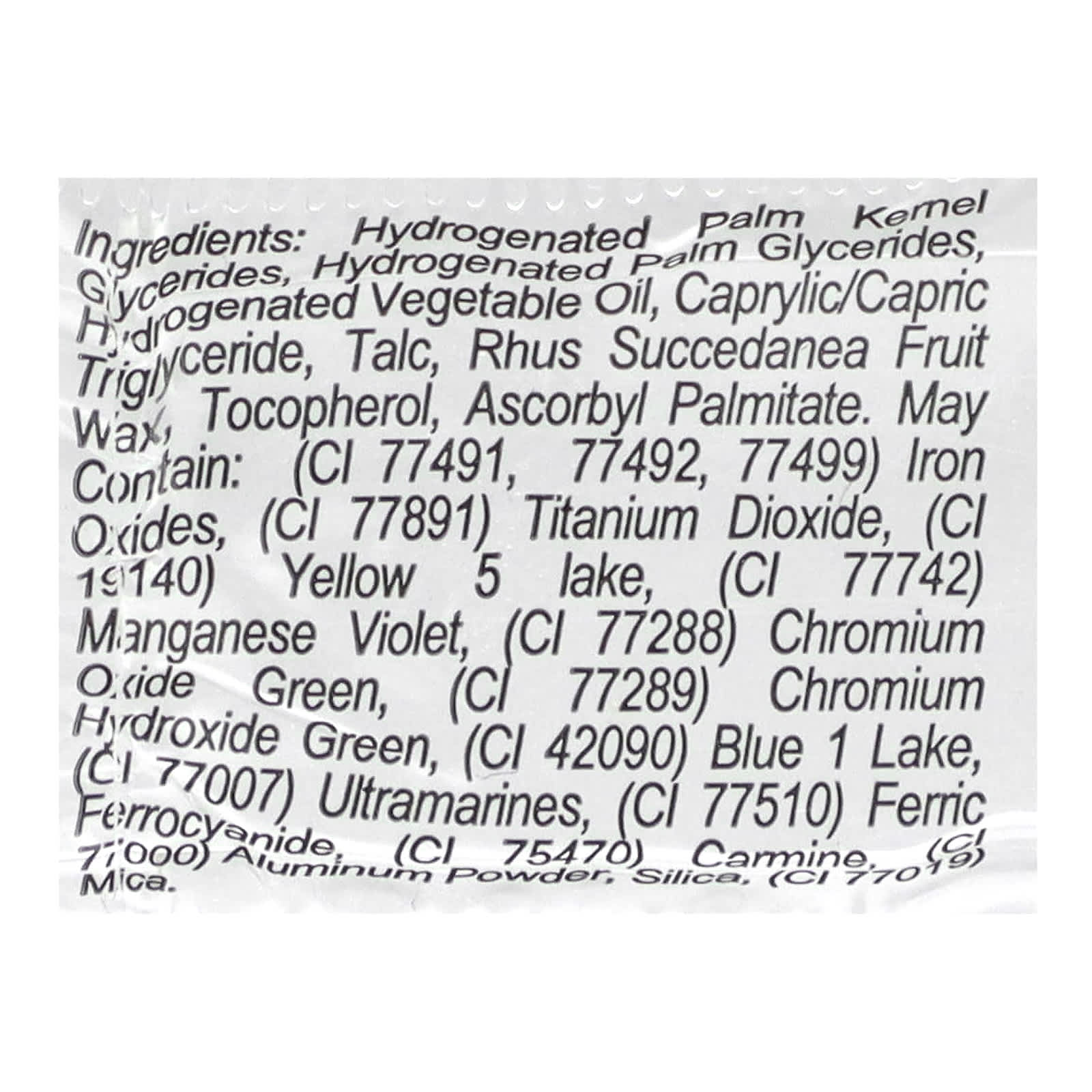 Гидрогенизированные пальмоядровые глицериды, гидрогенизированные пальмовые глицериды, гидрогенизированное растительное масло, каприловый/каприновый триглицерид, тальк, воск из плодов Rhus Succcedanea, токоферол, аскорбил пальмитат. может содержать: (CI 77491,77492,77499) оксид железа, (CI 77891) диоксид титана, (CI 19140) желтый 5 лак, (ci 77742) фиолетовый марганец, (CI 77288) оксид хрома зеленый, (CI 77289) зеленый гидроксид хрома, (CI 42090 Blue 1 Lake, (CI 77007) ультрамарины, (CI 77510) ферроцианид железа, (CI 75470) кармин, (CI 77000) алюминиевый порошок, диоксид кремния, (CI 77019) слюда.