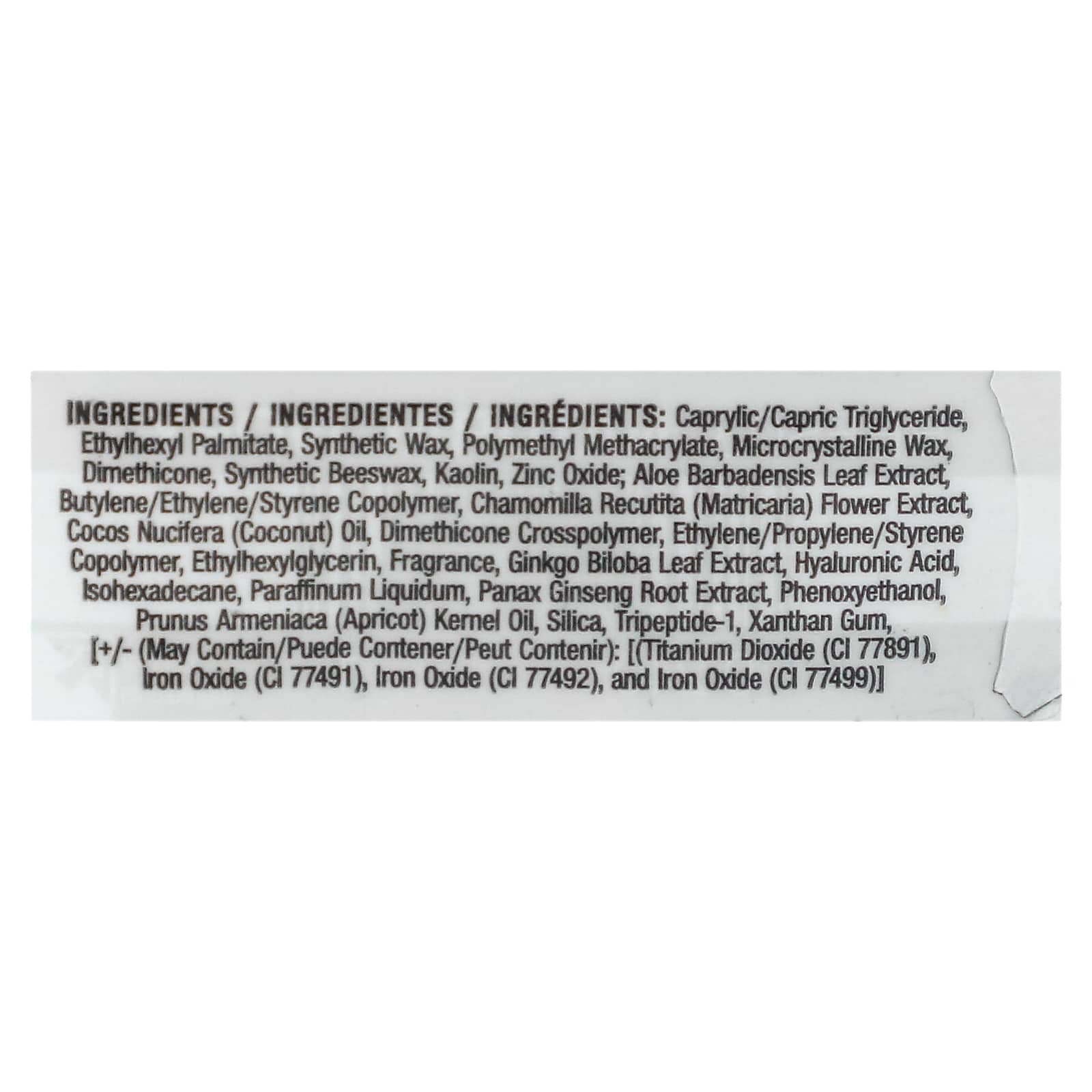 Каприловый/каприновый триглицерид, этилгексил пальмитат, синтетический воск, полиметилметакрилат, микрокристаллический воск, диметикон, синтетический воск, каолин, оксид цинка; экстракт листьев алоэ вера, сополимер бутилена/этилена/стирола, экстракт цветков ромашки лекарственной (Chamomilla recutita), кокосовое масло (Cocos nucifera), диметикон кроссполимер, сополимер этилена/пропилена/стирола, этилгексилглицерин, отдушка, экстракт листьев гинкго билоба (Ginkgo biloba), гиалуроновая кислота, изогексадекан, вазелиновое масло, экстракт корня женьшеня (Panax ginseng), феноксиэтанол, масло из косточек абрикоса (Prunus armeniaca), диоксид кремния, трипептид-1, ксантановая камедь, [+/- (может содержать диоксид титана (CI 77891), оксид железа (CI 77491), оксиды железа (CI 77492), оксид железа (CI 77499)].