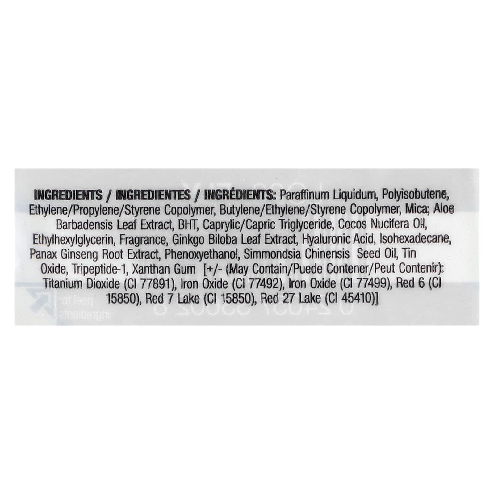 Вазелиновое масло, полиизобутен, сополимер этилена/пропилена/стирола, сополимер бутилена/этилена/стирола, слюда; экстракт листьев алоэ вера, бутилгидрокситолуол, каприловый/каприновый триглицерид, масло кокоса (Cocos nucifera), этилгексилглицерин, отдушка, экстракт листьев гинкго билоба (Ginkgo biloba), гиалуроновая кислота, изогексадекан, экстракт корня женьшеня (Panax ginseng), феноксиэтанол, масло семян жожоба (Simmondsia chinensis), оксид олова, трипептид-1, ксантановая камедь [+/- (может содержать): диоксид титана (CI 77891), оксиды железа (CI 77492), оксид железа (CI 77499), красный 6 (с) 15850), краситель красный 7 лак (CI 15850), красное озеро 27 (CI 45410)].