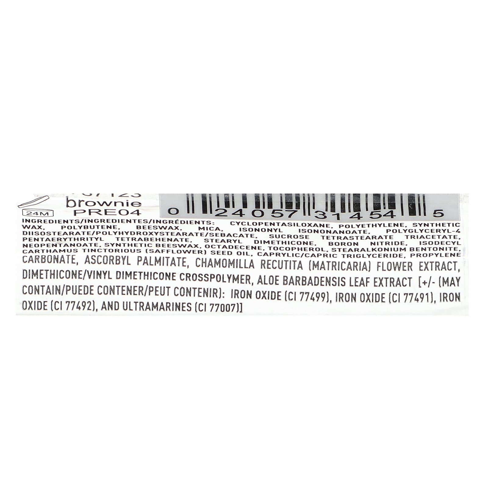 циклопентасилоксан, полиэтилен, синтетический воск, полибутен, пчелиный воск, изононил изононаноат, полиглицерил-4 диизостеарат/полигидроксистеарат/себакат, тетрастеарат триацетат сахарозы, нитрид бора, пентаэритритил тетрабегенат, стеарил диметикон, изодецилнеопентаноат; экстракт листьев алоэ вера, аскорбил пальмитат, каприловый/каприновый триглицерид, масло семян сафари, экстракт цветков ромашки (Chamomilla recutita), диметикон/винил диметикон кроссполимер, октадецен, пропиленкарбонат, стеаралкония бентонит, синтетический воск, токоферол, оксиды железа (CI 77499), кармин (CI 75470).