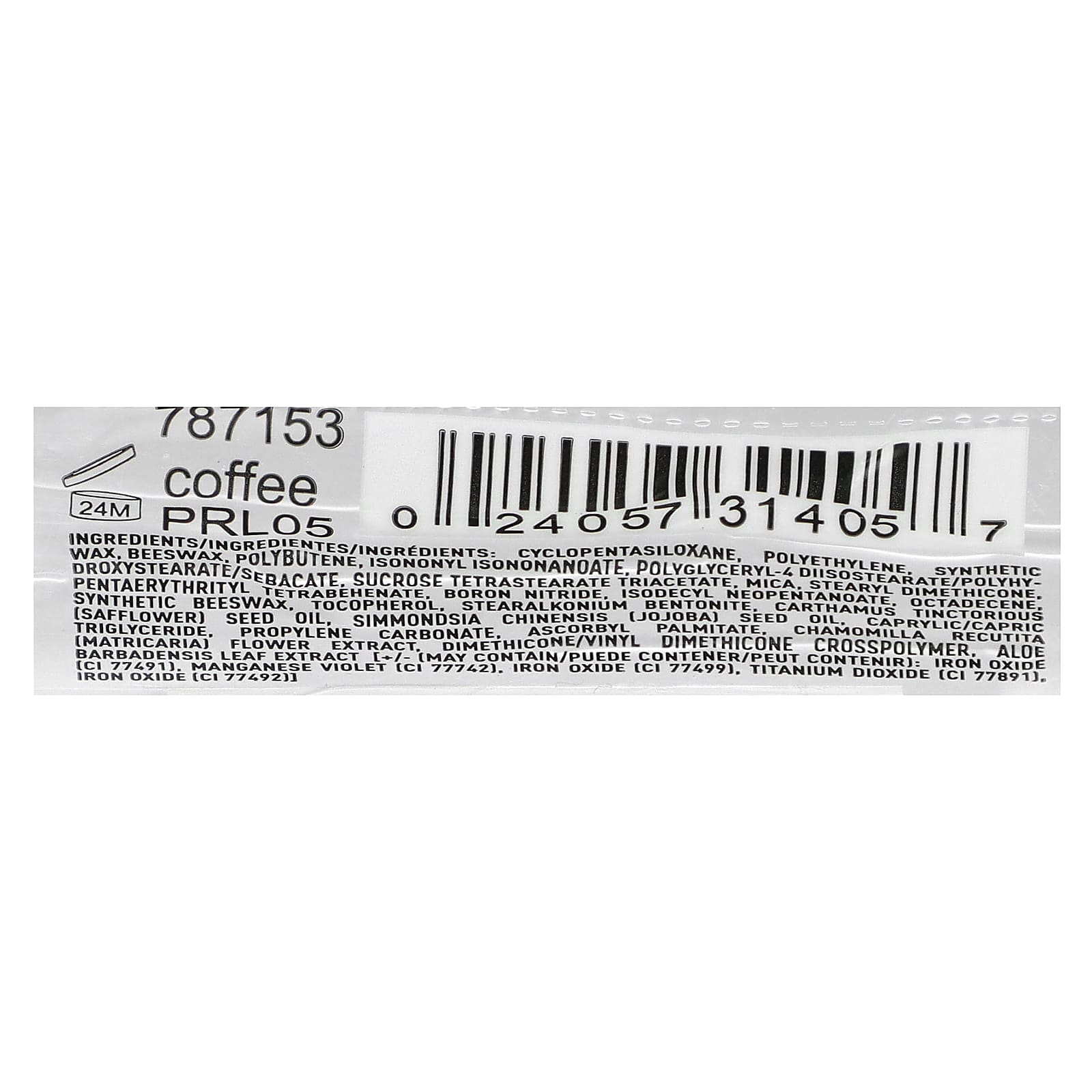 циклопентасилоксан, полиэтилен, синтетический воск, пчелиный воск, полибутен, изононил изононаноат, полиглицерил-4 диизостеарат/полигидроксистеарат/себакат, тетрастеарат триацетат сахарозы, слюда, стеарил диметикон, пентаэритритил тетрабегенат, нитрид бора, изодецилнеопентаноат, октадецен, синтетический пчелиный воск, токоферол, стеаралкония бентонит, масло семян сафлора (Carthamus tinctorius), масло из семян жожоба (Simmondsia chinensis), краситель триглицерид, пропиленкарбонат, аскорбил пальмитат, экстракт цветков ромашки лекарственной (Chamomilla recutita), диметикон/винил диметикон кроссполимер, экстракт листьев алоэ вера [+/- (может содержать): оксид железа (CI 77491), марганцево-фиолетовый (CI 77742), оксид железа (CI 77499), диоксид титана (CI 77891), оксид железа (CI 77492)]