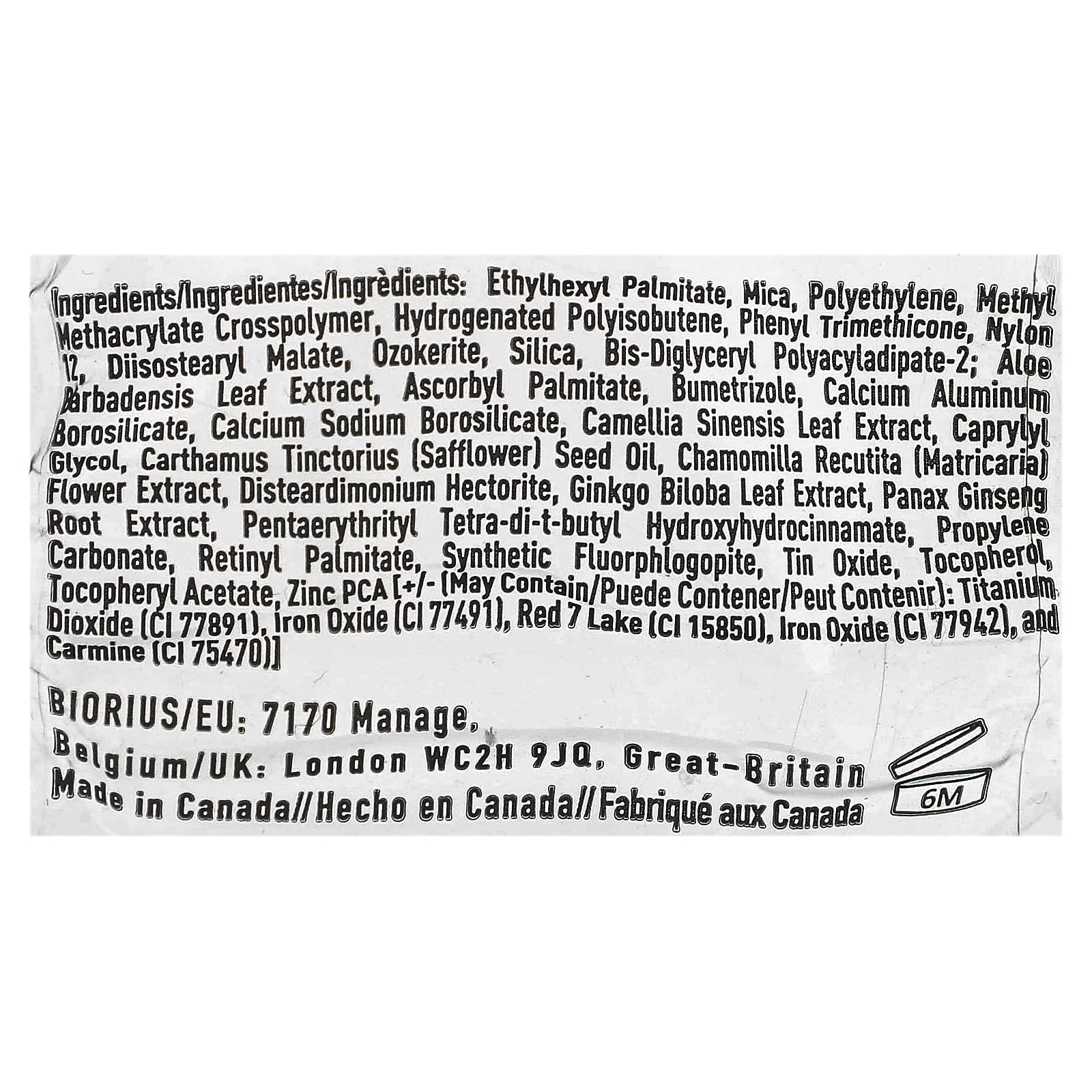 Этилгексил пальмитат, слюда, полиэтилен, метил метакрилат кроссполимер, гидрогенизированный полиизобутен, фенилтриметикон, нейлон 12, диизостеарил малат, озокерит, диоксид кремния, бис-диглицерил полиациладипат-2; экстракт листьев алоэ вера, аскорбил пальмитат, буметризол, кальций алюминий боросиликат, кальций натрий боросиликат, экстракт листьев зеленого чая (Camellia sinensis), каприлилгликоль, масло семян сафлора (Carthamus tinctorius), экстракт цветков ромашки лекарственной (Chamomilla recutita), дистеардимония гекторит, экстракт листьев гинкго билоба (Ginkgo biloba), экстракт корня женьшеня (Panax ginseng), пентаэритритил тетра-ди-трет-бутил гидроксигидроциннамат, пропиленкарбонат, ретинилпальмитат, синтетический фторфлогопит, оксид олова, токоферол, токоферилацетат, цинк pca [+/- Может содержать диоксид титана (CI 77891), оксид железа (CI 77491), краситель красный 7 лак (CI 15850), оксид железа (CI 77942), и кармин (CI 75470)].