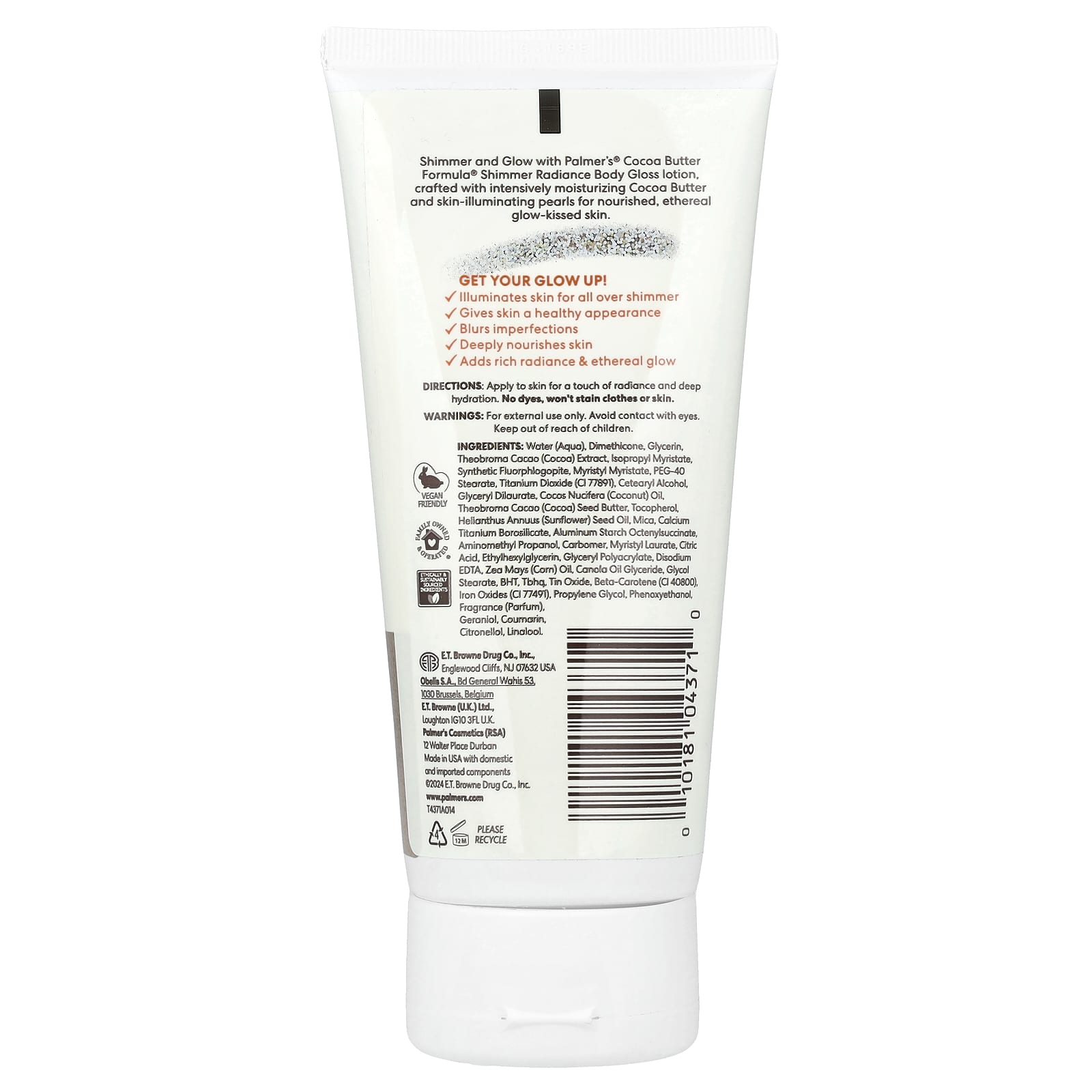 Сияние и сияние благодаря лосьону Palmer's® Cocoa Butter Formula® Shimmer Radiance Body Gloss с интенсивно увлажняющим маслом какао и сияющими жемчужинами для питательной, сияющей кожи.