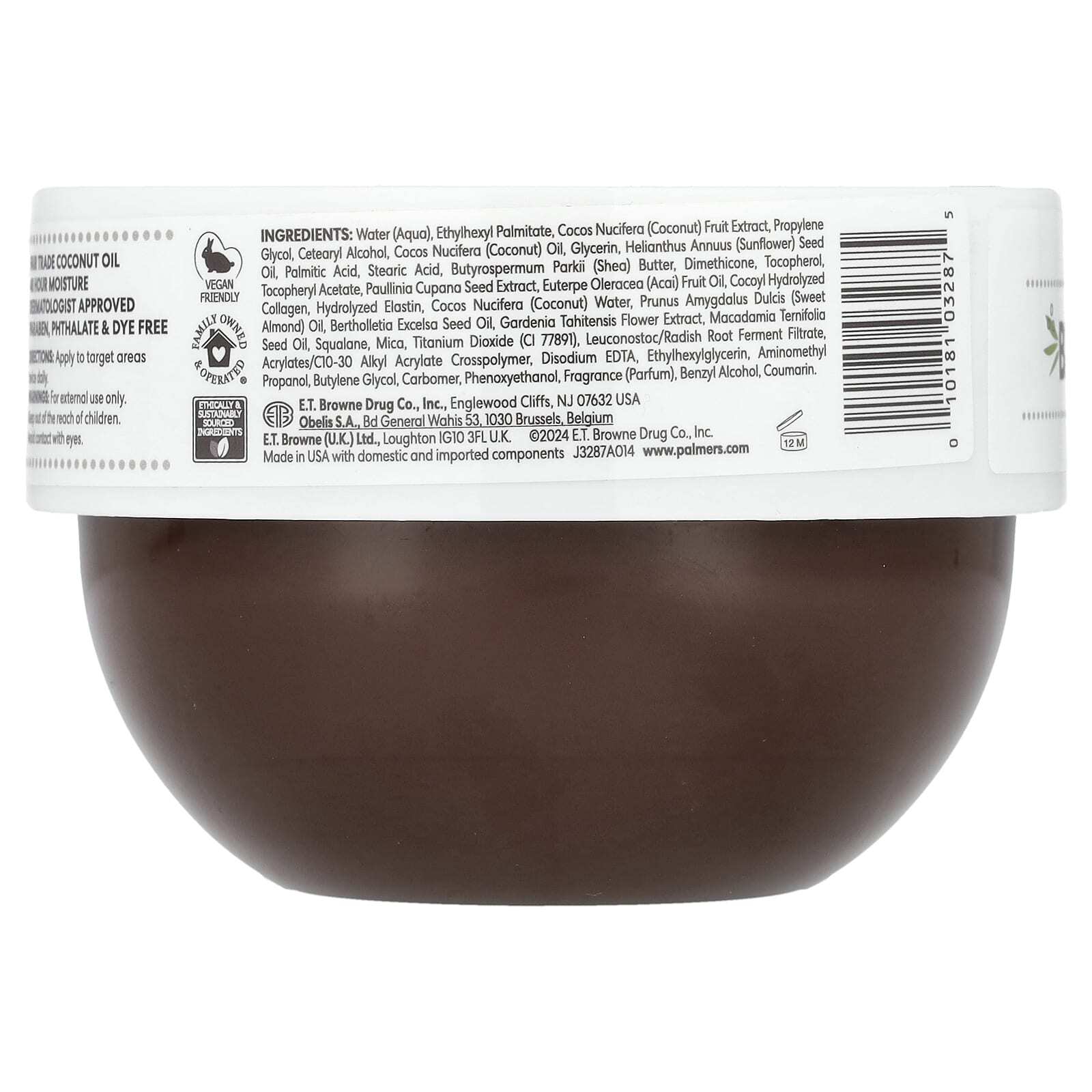 Вода (Aqua), этилгексил пальмитат, экстракт кокоса (Cocos nucifera), пропиленгликоль, цетеариловый спирт, кокосовое масло (Cocos nucifera), глицерин, подсолнечное масло (Helianthus annuus), пальмитиновая кислота, стеариновая кислота, масло ши (Butyrospermum parkii), диметикон, токоферол, токоферилацетат, экстракт семян гуараны (Paullinia cupana), масло плодов асаи (Euterpe oleracea), кокоил гидролизованный коллаген, гидролизованный эластин, кокосовая вода (Cocos nucifera), масло сладкого миндаля (Prunus amygdalus dulcis), масло семян бертоллетии (bertholletia excelsa), экстракт цветков гардении (Gardenia tahitensis), масло макадамии (Macadamia ternifolia), сквалан, слюда, диоксид титана (CI 77891), лейконосток/ферментированный фильтрат корня редиса, акрилат/c10-30 алкил акрилат кроссполимер, двунатриевая ЭДТК, этилгексилглицерин, аминометил пропанол, бутиленгликоль, карбомер, феноксиэтанол, отдушка (парфюмерная композиция), бензиловый спирт, кумарин.