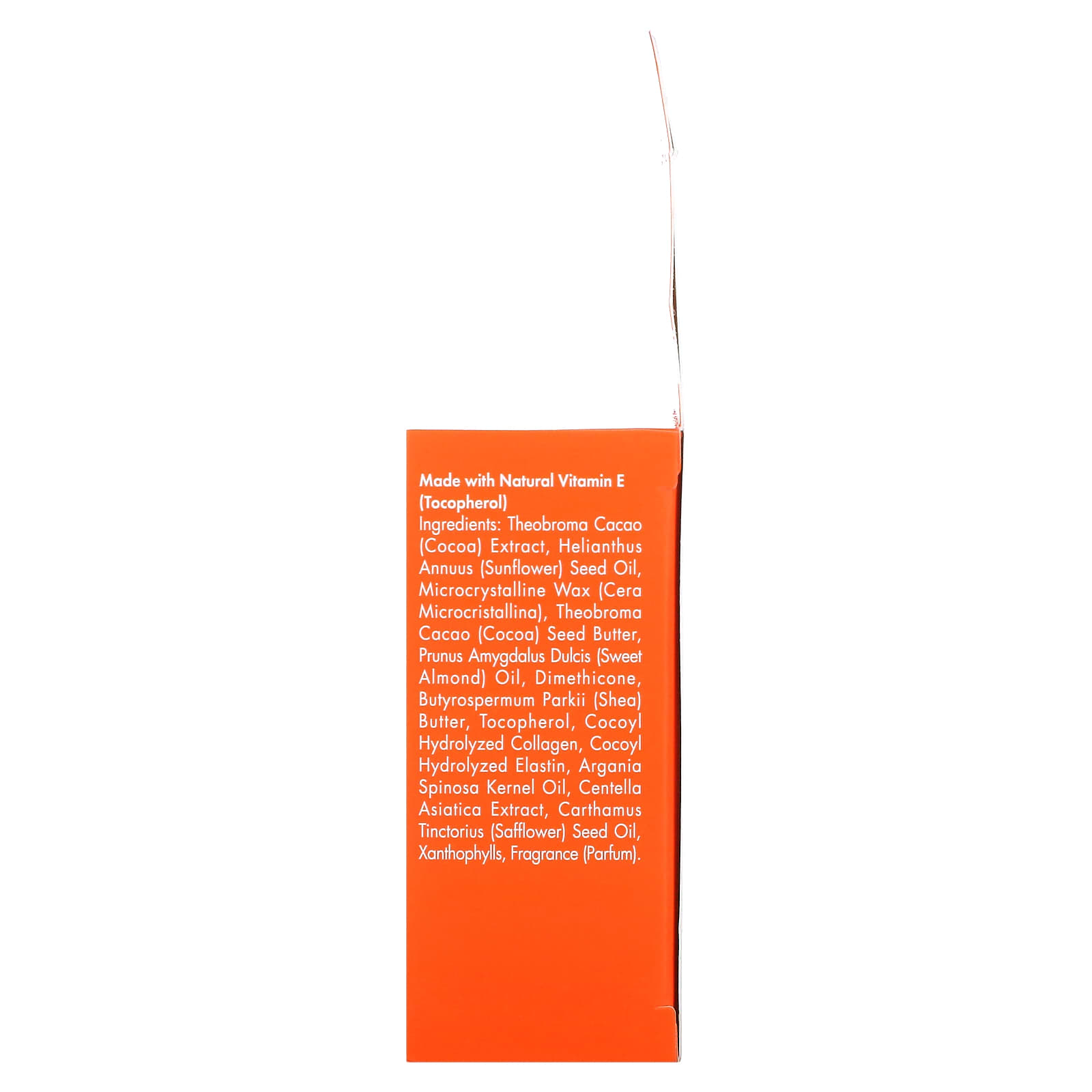 Экстракт какао (Theobroma cacao), масло семян подсолнечника (Helianthus annuus), микрокристаллический воск (Cera микрокристаллический), масло зерен какао (Theobroma cacao), масло сладкого миндаля (Prunus amygdalus dulcis), диметикон, масло ши (Butyrospermum parkii), токоферол, кокоил гидролизованный коллаген, кокоил гидролизованный эластин, аргановое масло (Argania spinosa), экстракт готу колы (Centella asiatica), масло семян сафлора (Carthamus tinctorius), ксантофиллы, отдушка (парфюмерная композиция).