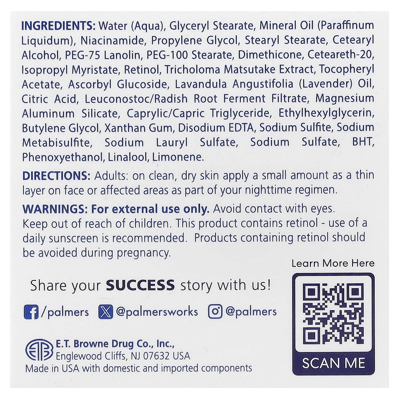 Более 175 лет Palmer's® производит качественные продукты, которые заметно корректируют пигментные пятна, темные пятна от повреждения солнцем и шрамы от акне. Этот антивозрастной ингредиент с ретинолом помогает заметно улучшить эластичность и эластичность кожи, а также уменьшить мелкие морщинки. Результат - безупречное сияние кожи.