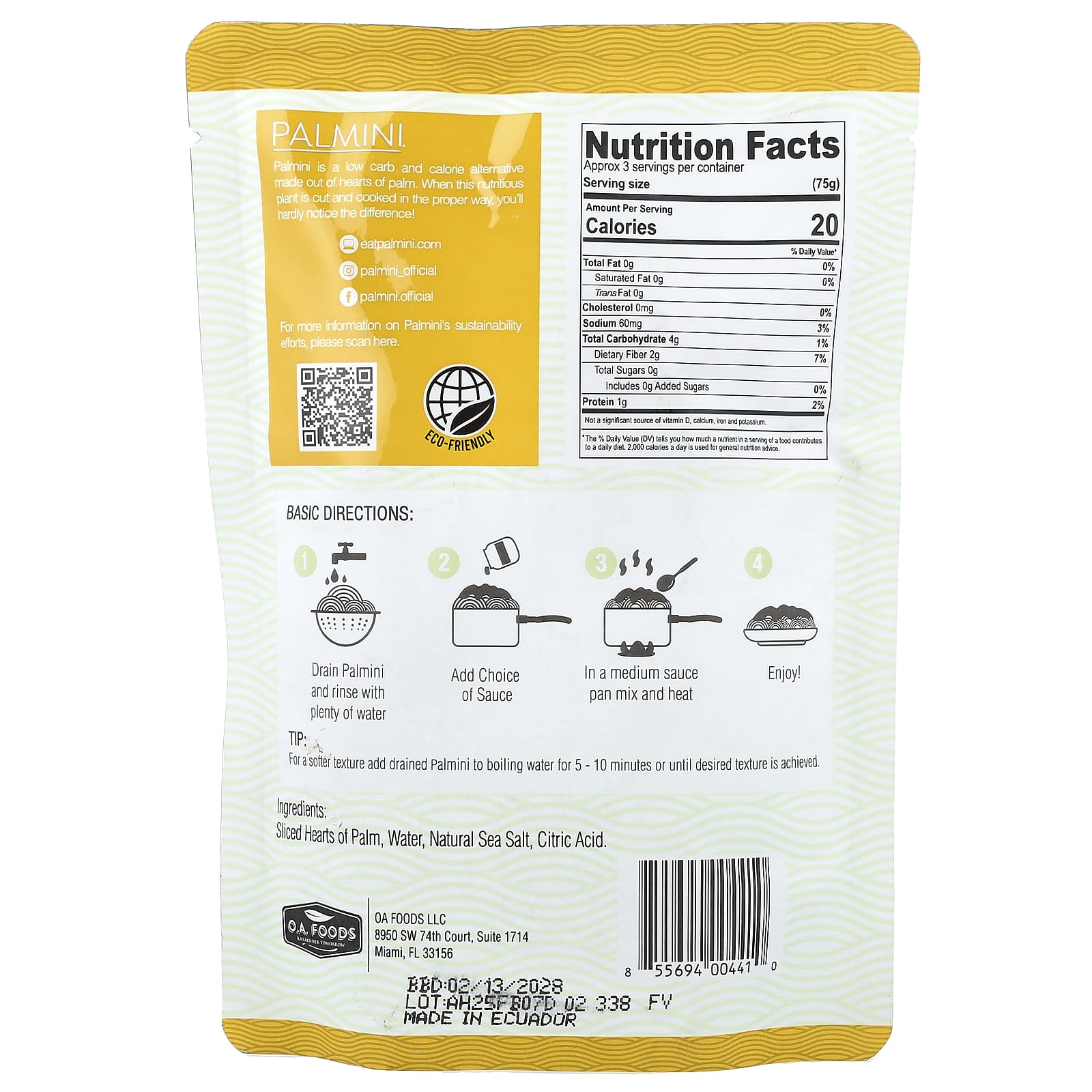 Нарезанные сердца пальмы, вода, натуральная морская соль, лимонная кислота.