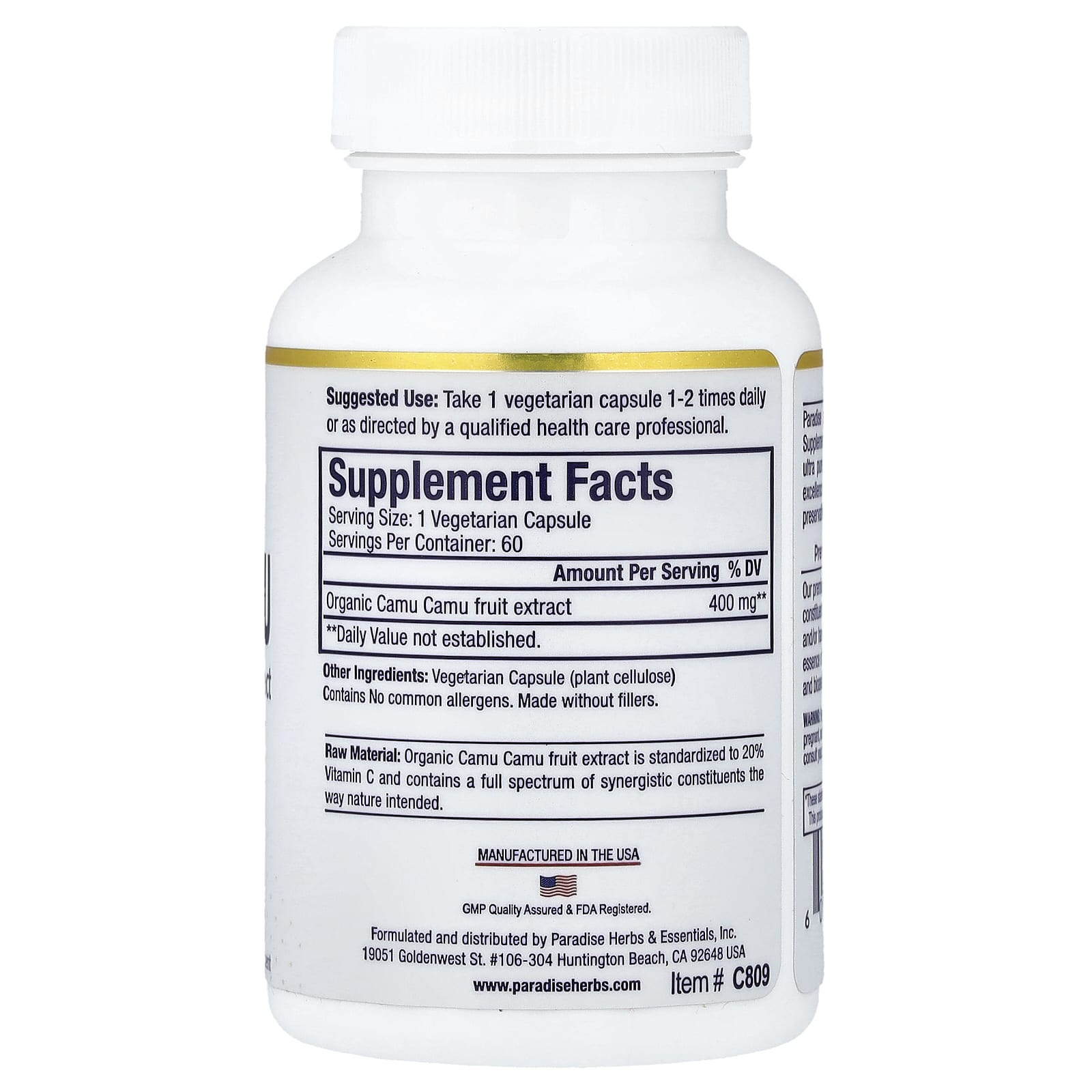 Необработанный продукт: Органический экстракт плодов каму-каму стандартизирован до 20% витамина С и содержит полный спектр синергетических компонентов, как задумано природой.