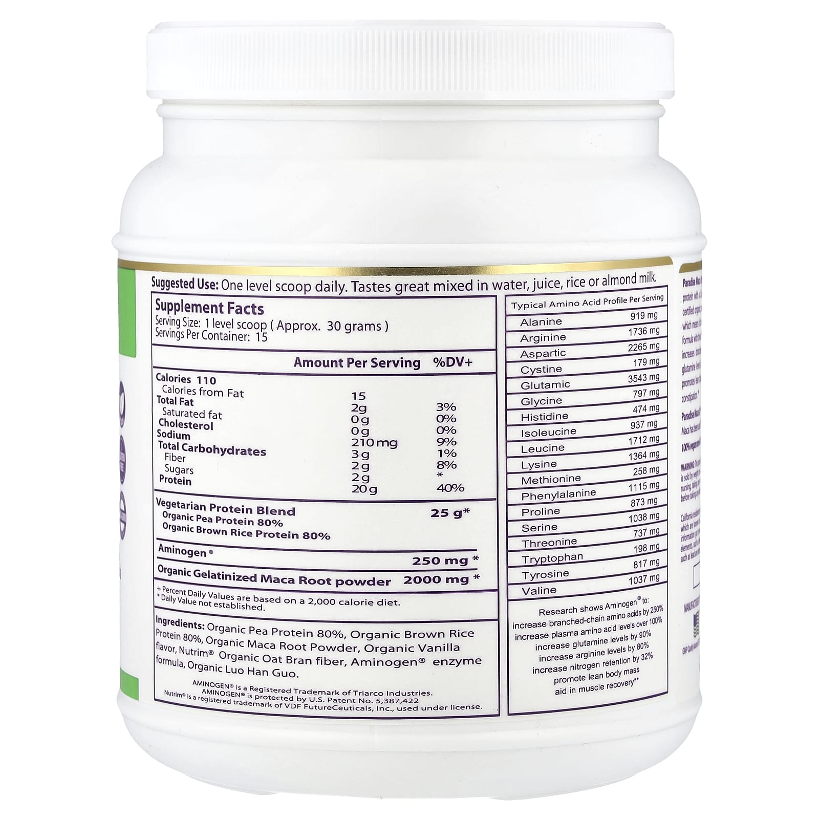 Вегетарианский энергетический протеин Paradise Maca Up® - это полноценный веганский гипоаллергенный протеин со сбалансированным аминокислотным составом, полученный из сертифицированного органического коричневого риса и сертифицированного органического гороха. Гороховый протеин легко усваивается и оказывает действие длительного высвобождения, что обеспечивает его превосходную перевариваемость и продолжительное влияние. Мы усовершенствовали нашу формулу, добавив фермент растительного происхождения Aminogen®. Исследования показывают, что Aminogen® увеличивает уровень аминокислот с разветвленной цепью на 250%, уровень аминокислот в плазме более чем на 100%, уровень глутамина на 90%, уровень аргинина на 80% и удержание азота на 32%. Он также способствует увеличению мышечной массы, способствует восстановлению мышц и уменьшает газообразование, вздутие живота и запоры.
