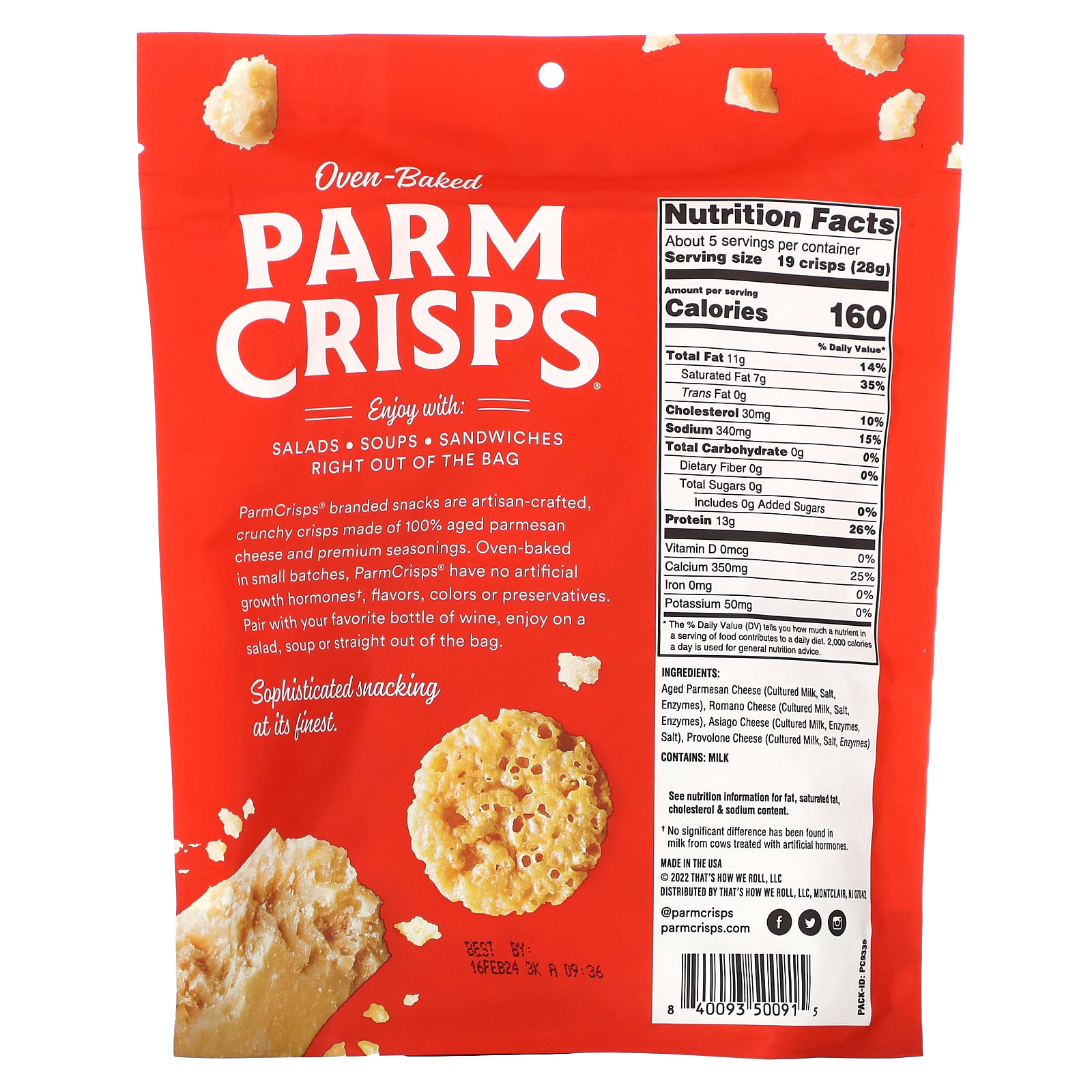 Снеки под брендом ParmCrisps® — это хрустящие чипсы, изготовленные вручную из 100% выдержанного сыра пармезан и приправ премиального качества. Выпекаемые в печи небольшими партиями, ParmCrisps® не содержат искусственных гормонов роста†, ароматизаторов, красителей и консервантов. Добавьте бутылку любимого вина, добавьте в салат, суп или прямо из упаковки.