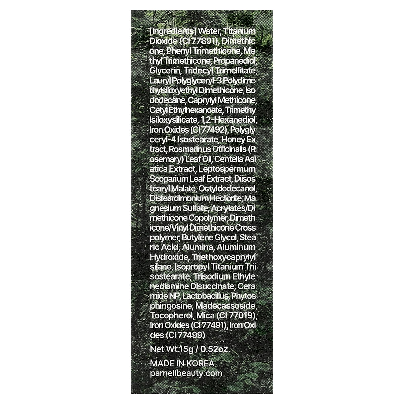 Водный диоксид титана (CI 77891), диметикон фенил триметикон, метилтриметикон, пропандиол, глицерин, тридецил тримеллитат лаурил полиглицерил-3 полидиметилсилоксиэтил диметикон, изододекан, каприлилметикон цетил этилгексаноат, триметилсилоксисиликат, 1,2-гександиол, оксиды железа (кл. 77492), полиглицерил-4 изостеарат, медовый экстракт, масло из листьев розмарина (Rosmarinus officinalis), экстракт готу колы (Centella asiatica), экстракт листьев лептосперма (Leptospermum scoparium), диизостеарил малат, октилдодеканол, дистеардимониум, гекторит, сульфат магния, акрилаты / диметикон сополимер диметикон / винилдиметикон кросс-полимер, бутиленгликоль, стеариновая кислота, оксид алюминия, гидроксид алюминия, триэтоксикаприлилсилан, изопропиловый триизостеарат титана, тринатрия этилендиамин дисукцинат, керамид NP, лактобактерии фитосфингозина, мадекассозид токоферол, слюда (CI 77019), оксиды железа (CI77491), оксиды железа (CI 77499).