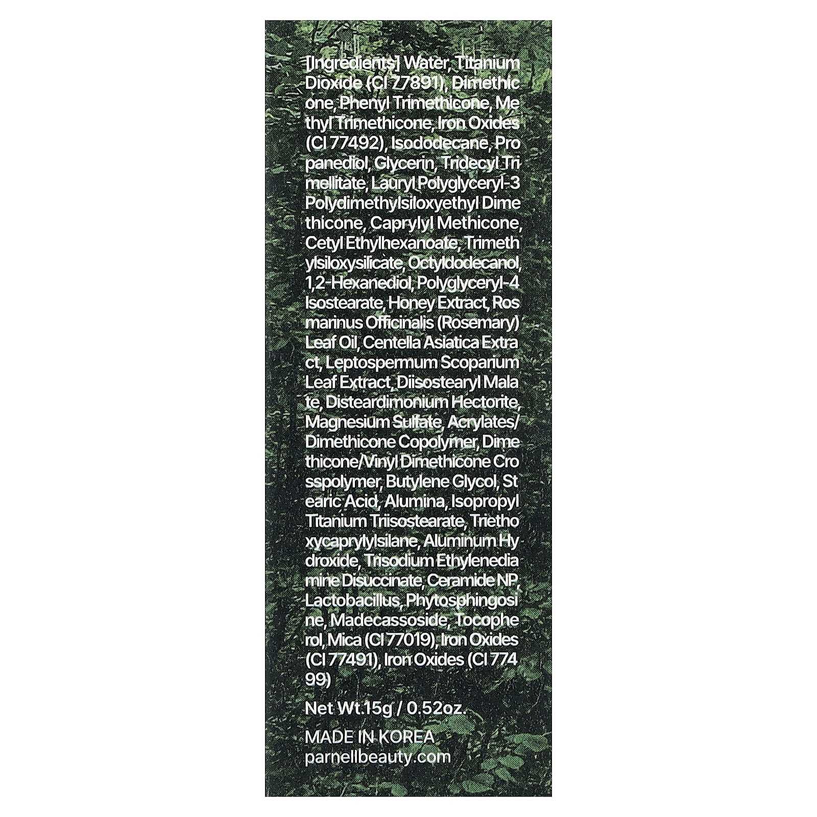 Вода, диоксид титана (CI 77891), диметикон, фенилтриметикон, метилтриметикон, оксиды железа (CI 77492), изододекан, пропандиол, глицерин, тридецил тримеллитат, лаурилполиглицерил-3-полидиметилсилоксиэтилдиметикон, каприлил метикон, цетилэтилгексаноат, триметилсилоксисиликат, октилдодеканол, 1,2-гександиол, полиглицерил-4 изостеарат, экстракт меда, масло из листьев розмарина (Rosmarinus officinalis), экстракт готу колы (Centella asiatica), экстракт листьев лептосперма (Leptospermum scoparium), диизостеарил малат, дистеардимония гекторит, сульфат магния, сополимер акрилатов и диметикона, диметикон/винил диметикон кроссполимер, бутиленгликоль, стеариновая кислота, оксид алюминия, изопропиловый триизостеарат титана, триэтоксикаприлилсилан, гидроксид алюминия, тринатрия этилендиамин дисукцинат, керамид NP, бактерии Lactobacillus, фитосфингозин, мадекассосид, токоферол, слюда (CI 77019), оксиды железа (CI 77491), оксиды железа (кл. 77499).