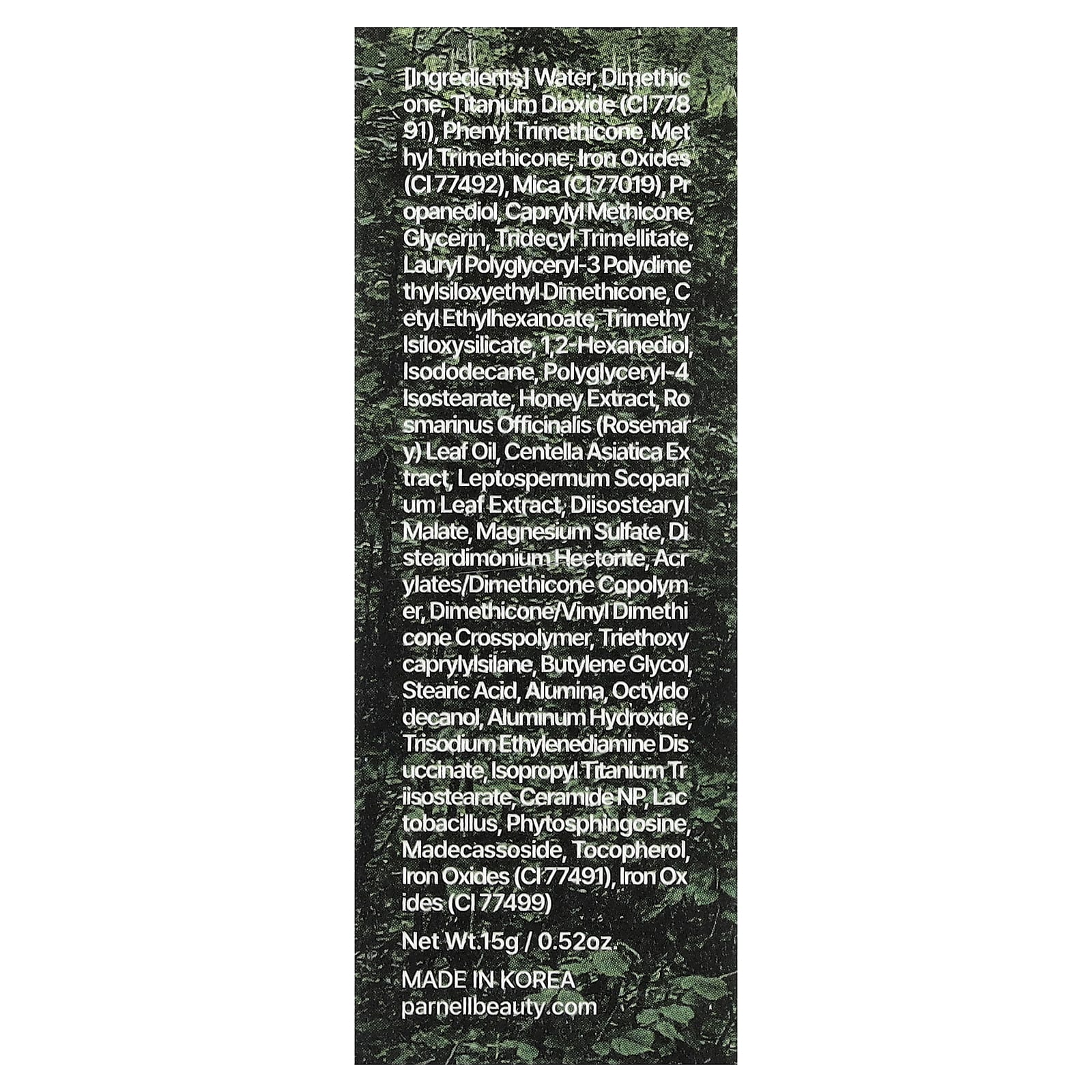 Вода, диметикон, диоксид титана (CI 77891), фенилтриметикон, метилтриметикон, оксиды железа (CI77492), слюда (CI 77019), пропандиол, каприлил метикон, глицерин, тридецил тримеллитат, лаурилполиглицерил-3-полидиметилсилоксиэтилдиметикон, цетилэтилгексаноат, триметил изилоксисиликат 1,2-гександиол, изододекан, полиглицерил-4 изостеарат, экстракт меда, масло из листьев розмарина (Rosmarinus officinalis), экстракт готу колы (Centella asiatica), экстракт листьев чешуи (Leptospermum scopanum), диизостеарил малат, сульфат магния, дистеардимония гекторит, сополимер акрилатов / диметикона, диметикон/винил диметикон кроссполимер, триэтоксикаприлилсилан, бутиленгликоль, стеариновая кислота, оксид алюминия, октилдодеканол, гидроксид алюминия, тринатрия этилендиамин дисукцинат, изопропилтитана трисостеарат, керамид NP, бактерии Lactobacillus, фитосфингозин, мадекассосид, токоферол, оксиды железа (CI 77491), оксиды железа (CI 77499).