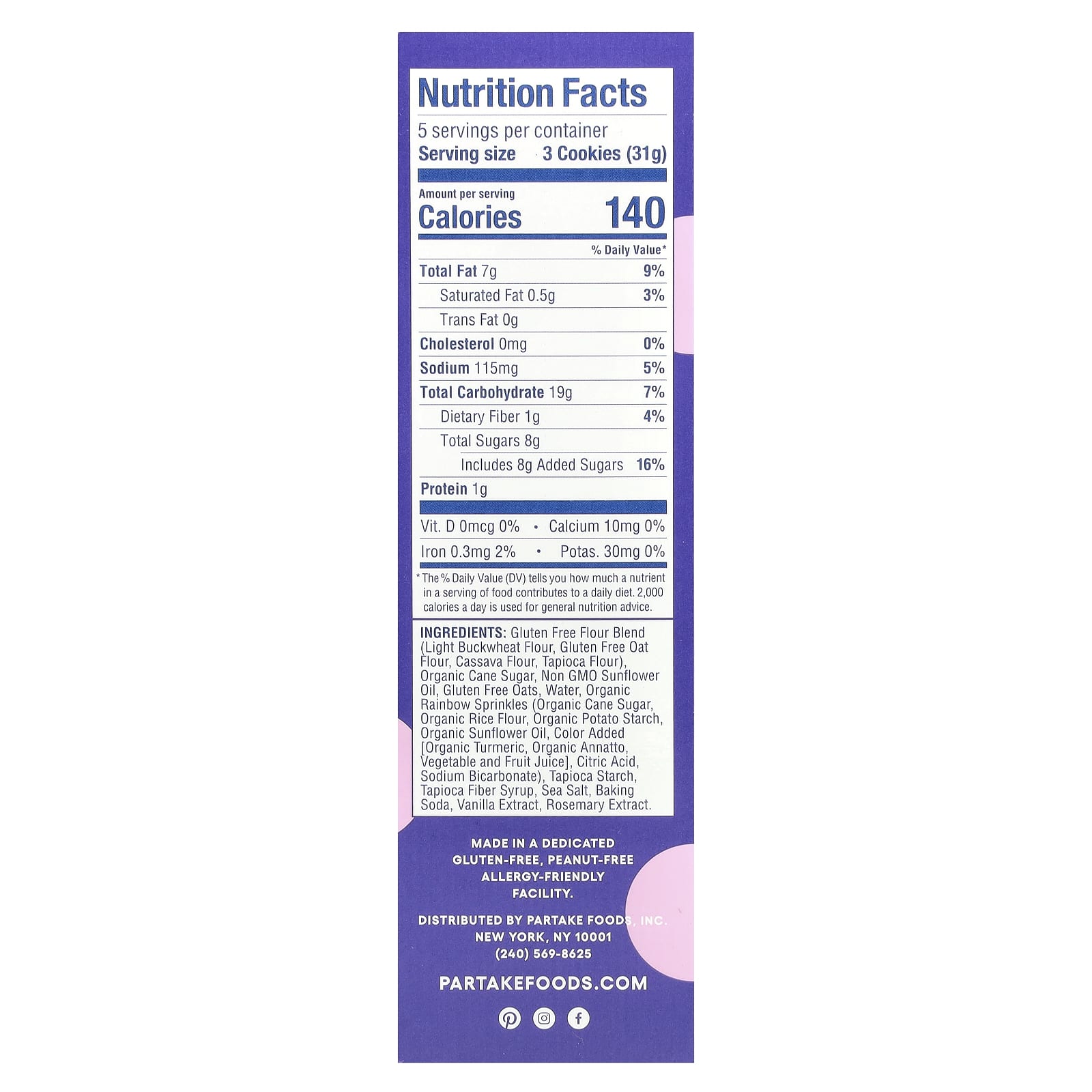 Смесь муки без глютена, овсяная мука без глютена, мука из кассавы, тапиоковая мука), органический тростниковый сахар, подсолнечное масло без ГМО, овес без глютена, вода, органическая посыпка радуги (органический тростниковый сахар, органическая рисовая мука, органический картофельный крахмал, органическое подсолнечное масло, краситель [органическая куркума, органический овощной и фруктовый сок аннато], лимонная кислота, бикарбонат натрия), тапиоковый крахмал, сироп из клетчатки тапиоки, морская соль, пищевая сода, экстракт ванили, экстракт розмарина.