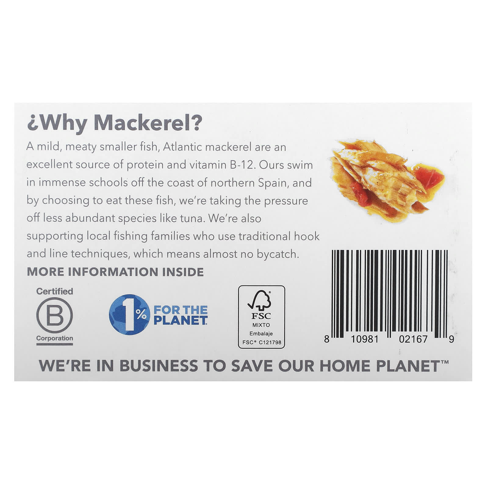 Атлантическая скумбрия - это мягкая мясная рыба меньшего размера, которая является отличным источником белка и витамина B12. Наши плавают огромными косяками у побережья северной Испании, и, выбирая эту рыбу, мы снимаем нагрузку с менее распространенных видов, таких как тунец. Мы также поддерживаем местные рыболовные семьи, которые используют традиционные методы рыболовства, что означает практически полное исключение прилова.