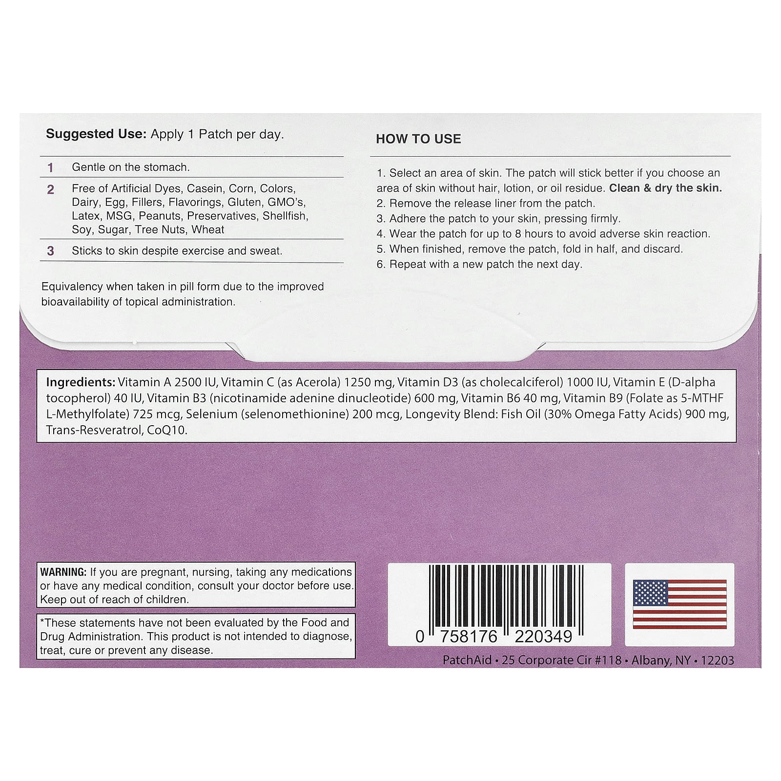 Витамин A (2500 МЕ), витамин C (в виде ацеролы) — 1250 мг, витамин D3 (в виде холекальциферола) 1000 МЕ, витамин E (d-альфа-токоферол) 40 МЕ, витамин B3 (никотинамид аденин динуклеотид) 600 мг, витамин B6 — 40 мг, витамин B9 (фолат в виде 5-mthf L-метилфолата) 725 мкг, селен (селенометионин) 200 мкг, Смесь для долголетия: рыбий жир (30% омега жирных кислот) 900 мг, Транс-ресвератрол, коэнзим Q10.