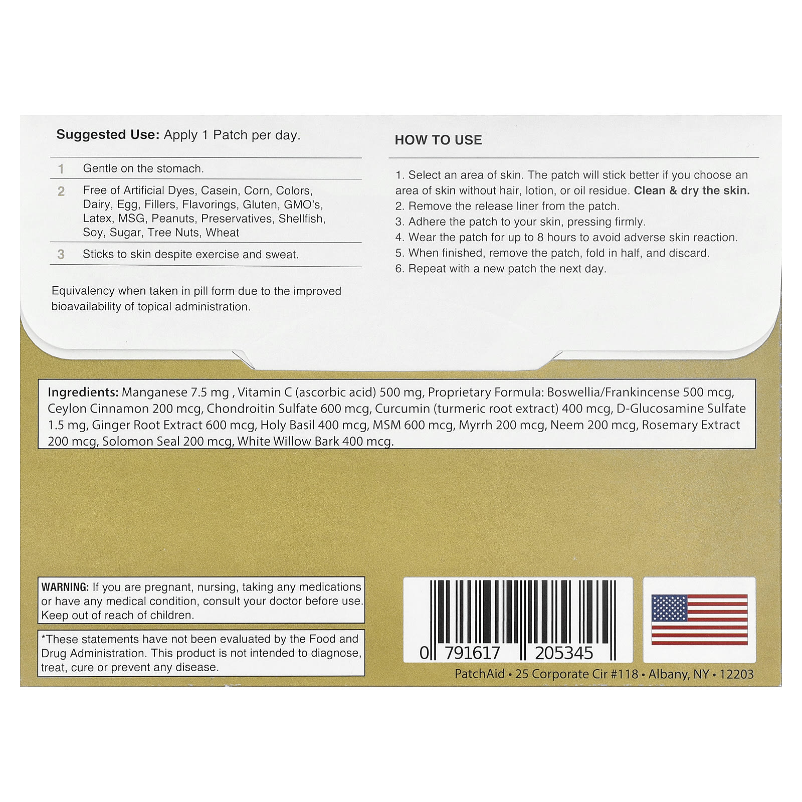 Марганец — 7,5 мг , витамин C (аскорбиновая кислота) 500 мг, запатентованная формула: босвеллия/ладан, 500 мкг, цейлонская корица, 200 мкг, хондроитинсульфат 600 мкг, куркумин (экстракт корня куркумы) 400 мкг, d-глюкозамин сульфат 1,5 мг, экстракт корня имбиря (600 мкг), Базилик священный, 400 мкг, 600 мкг мсм, мирра 200 мкг, ним 200 мкг, экстракт розмарина, 200 мкг, силикагель, 200 мкг, кора белой ивы, 400 мкг.