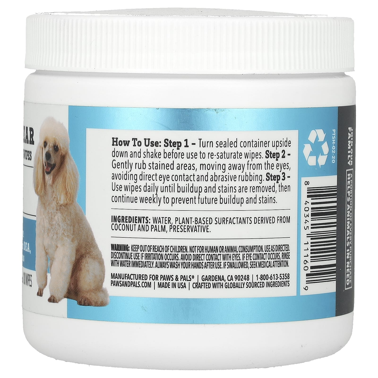 Салфетки для удаления слез от Paws & Pals® бережно и безопасно удаляют скопления слез и уменьшают видимость пятен, вызванных слезами, слюной и слизью с шерсти вашей собаки, с помощью натуральных ингредиентов, таких как очищающие средства на основе кокосового и пальмового масла.