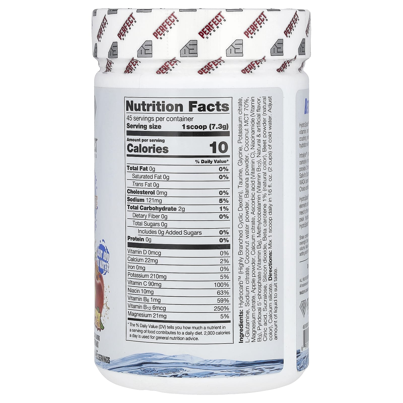 Hydrocarb™ (высокоразветвленный циклический декстрин), таурин, глицин, цитрат калия, L-глютамин, цитрат натрия, порошок из кокосовой воды, порошок из банана, кокос МСТ 70%, цитрат магния, порошок из яблока, цитрат кальция, аскорбиновая кислота (витамин C), никотинамид (витамин B3), пиридоксаль-5'-фосфат (витамин B6), метилкобаламин (витамин B12), натуральные и искусственные ароматизаторы, лимонная кислота, сукралоза, диоксид кремния, бета-каротин 1% (натуральный краситель), порошок из свеклы (натуральный краситель), силикат кальция.