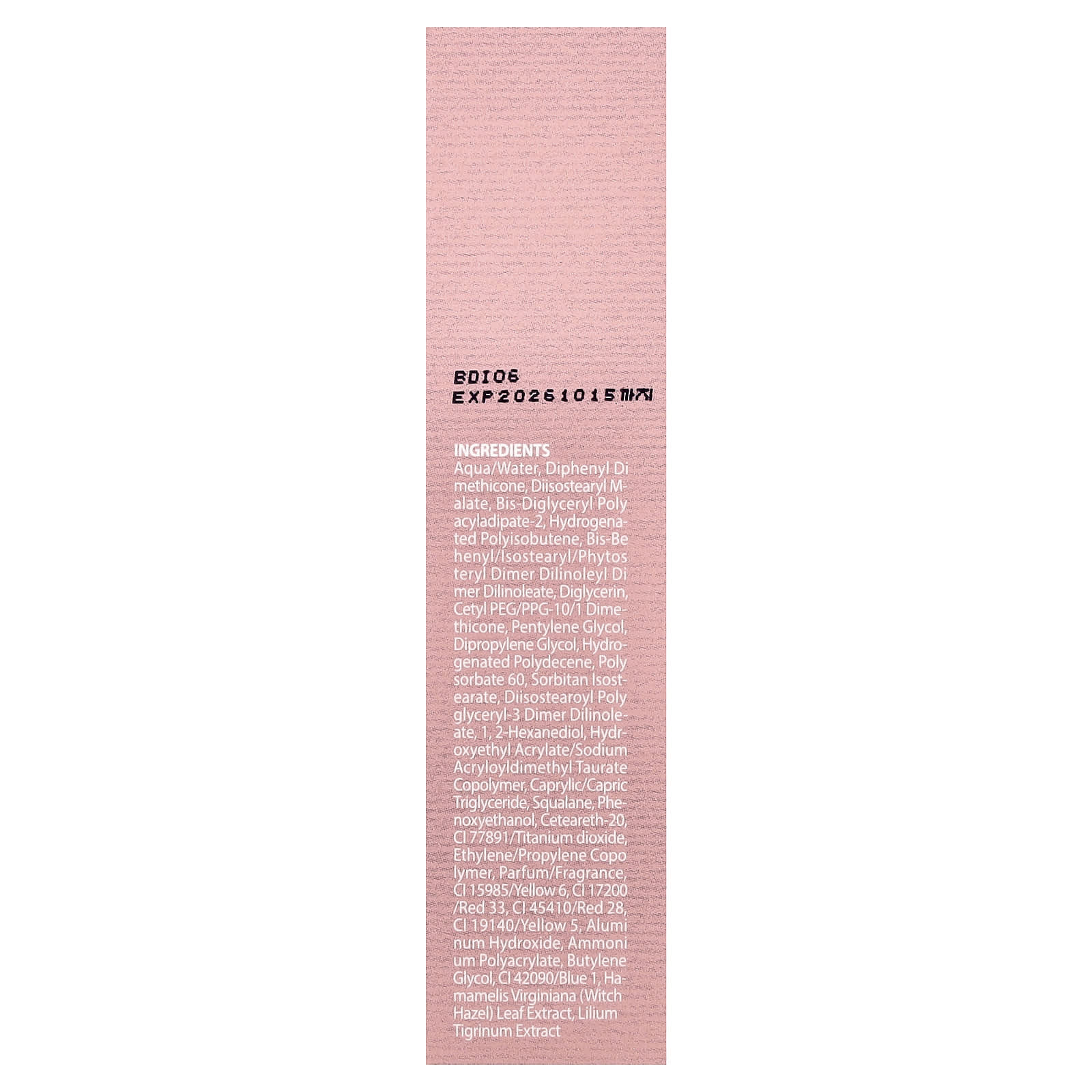 Вода, дифенил диметикон, диизостеарил малат, бис-диглицерил полиациладипат-2, гидрогенизированный полиизобутен, бис-бегенил/изостеарил/фитостерил димер дилинолеил димер дилинолеат, диглицерин, цетил ПЭГ/ППГ-10/1 диметикон, пентилен гликоль, дипропиленгликоль, гидрогенизированный полидецен, полисорбат 60, сорбитан изостеарат, диизостеароил полиглицерил-3 димер дилинолеат, 1,2-гександиол, гидроксиэтил акрилат/натрия акрилоилдиметилтаурата сополимер, каприловый/каприновый триглицерид, сквалан, феноксиэтанол, цетеарет-20, ци 77891 / диоксид титана, сополимер этилена/пропилена, парфюмерная композиция/отдушка, CI 15985 / желтый 6, CI 17200 / красный 33, CI 45410 / красный 28, краситель желтый 5 (CI 19140), гидроксид алюминия, полиакрилат аммония, бутиленгликоль, CI 42090 / синий 1, экстракт листьев гамамелиса (Hamamelis virginiana), экстракт лилии тигринум.