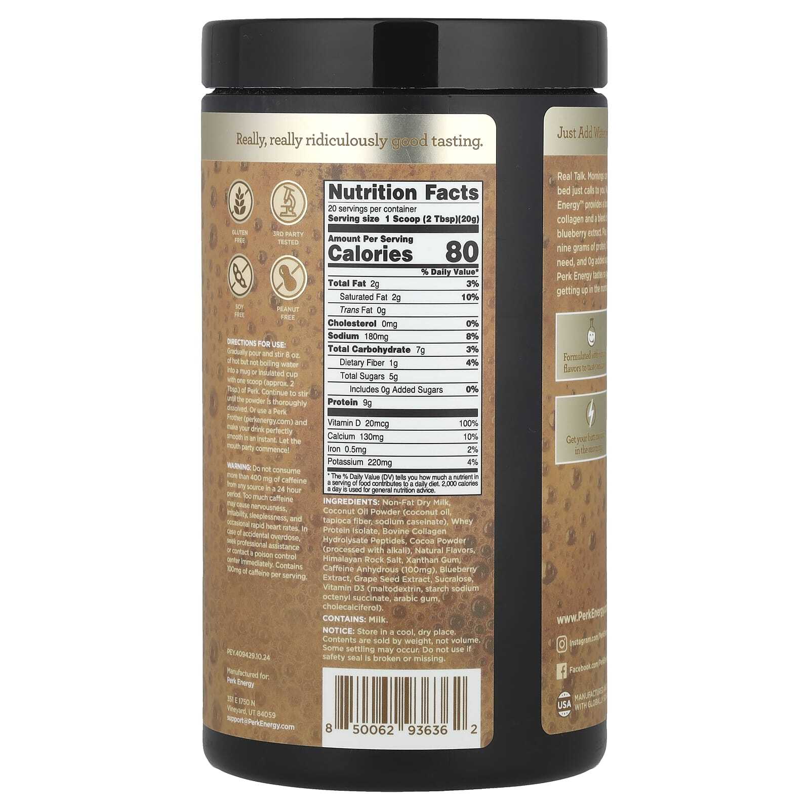 Настоящий разговор. Утро может быть тяжелым. Иногда кровать просто зовет вас. Мы им соответствуем. Вот почему Perk Energy ™ обеспечивает заряд энергии по утрам с коллагеном и смесью экстрактов виноградных косточек и черники. Кроме того, Perk Energy содержит девять граммов белка, 100% необходимого вам витамина D и большое количество сахара. И, что самое главное, Perk Energy настолько приятный на вкус, что вы с нетерпением ждете, когда встанете утром. Действительно!
