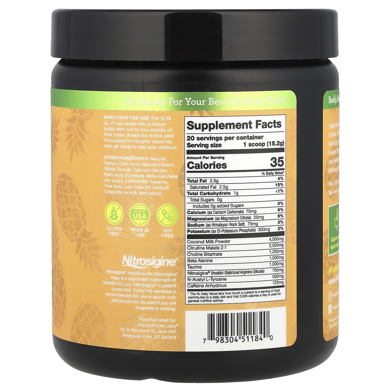 Turbo содержит нитрозигин®, цитрулина малат, бета-аланин, холин, N-ацетил L-тирозин, таурин, натрий (гималайскую каменную соль), кальций, калий, магний и порошковое кокосовое молоко. Эти ингредиенты обеспечивают питание, помогающее повысить производительность, поддерживая кровоток, восстановление мышц, буферизуя молочную кислоту, способствуя выработке энергии и многое другое.