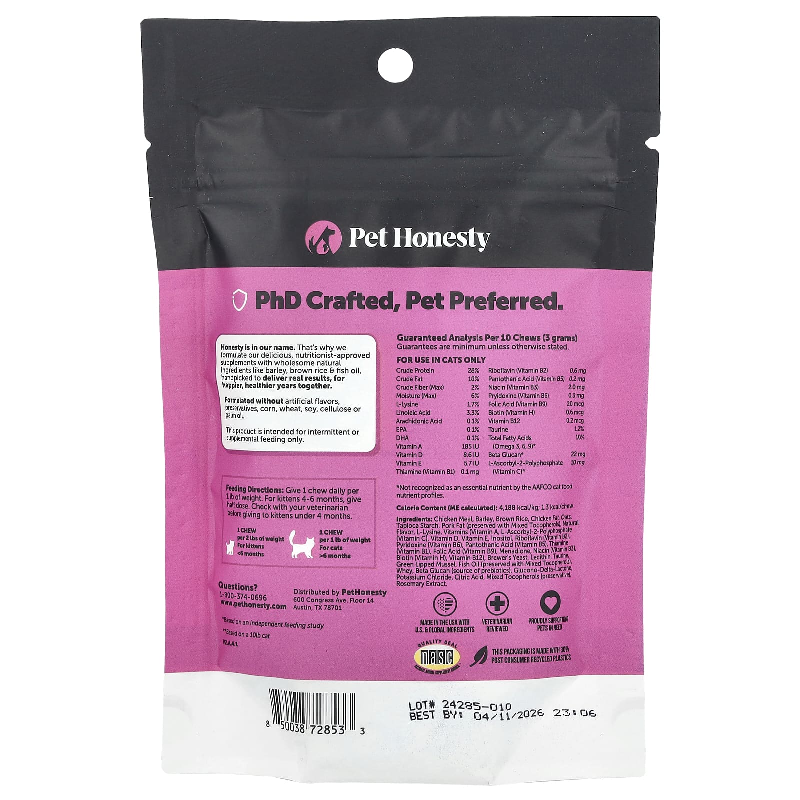 Давайте 1 жевательную таблетку в день на 1 фунт веса. Котятам 4–6 месяцев дайте половинную дозу. Перед тем, как давать корм котятам младше 4 месяцев, проконсультируйтесь с ветеринаром.