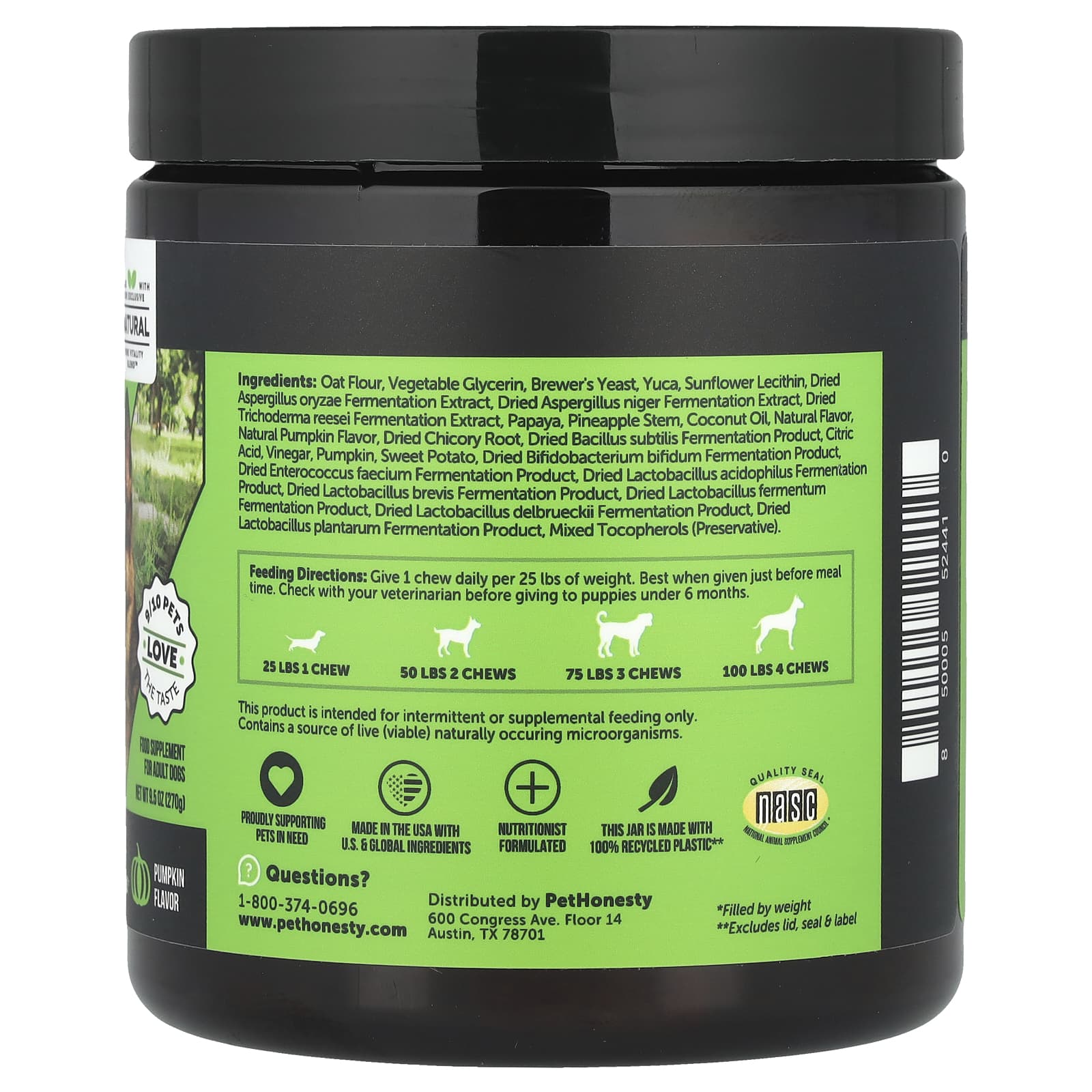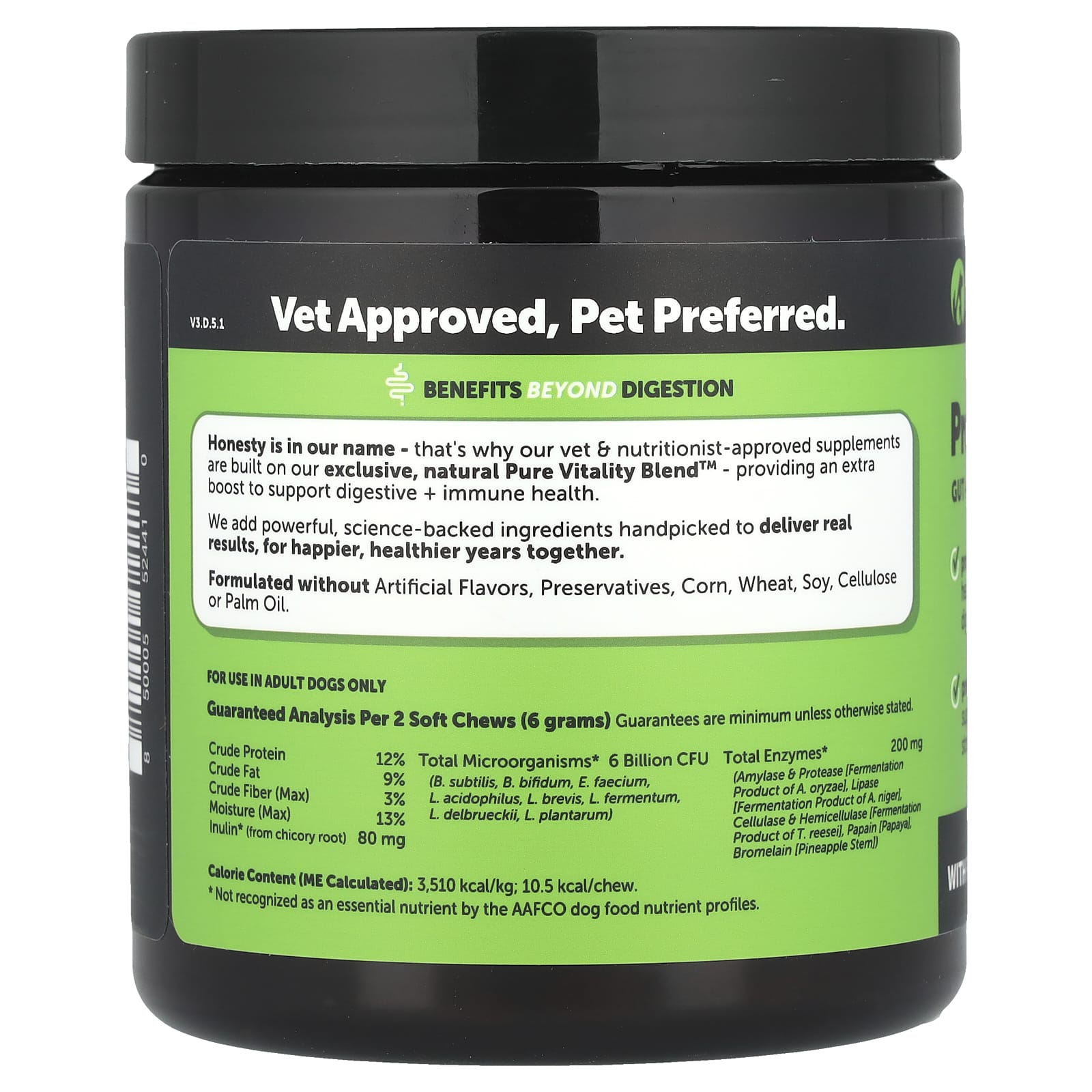 Овсяная мука, растительный глицерин, пивные дрожжи, юка, подсолнечный лецитин, сушеный ферментированный экстракт аспергилла (Aspergillus oryzae), сухой экстракт ферментации аспергилла черного (Aspergillus niger), сушеный экстракт ферментации Trichoderma reesei, папайя, стебель ананаса, кокосовое масло, натуральный ароматизатор, натуральный ароматизатор, сушеный корень цикория, продукт ферментации сушеной палочки (Bacillus subtilis), лимонная кислота, уксус, тыква, батат, сухой продукт ферментации бифидобактерии бифидум (Bifidobacterium bifidum), сухой продукт ферментации Enterococcus faecium, сухой продукт ферментации лактобактерий (Lactobacillus acidophilus), сухой продукт ферментации Lactobacillus brevis, сухой продукт ферментации лактобактерий (Lactobacillus fermentum), сухой продукт ферментации Lactobacillus delbrueckii, сухой продукт ферментации Lactobacillus plantarum, смешанные токоферолы (консервант).