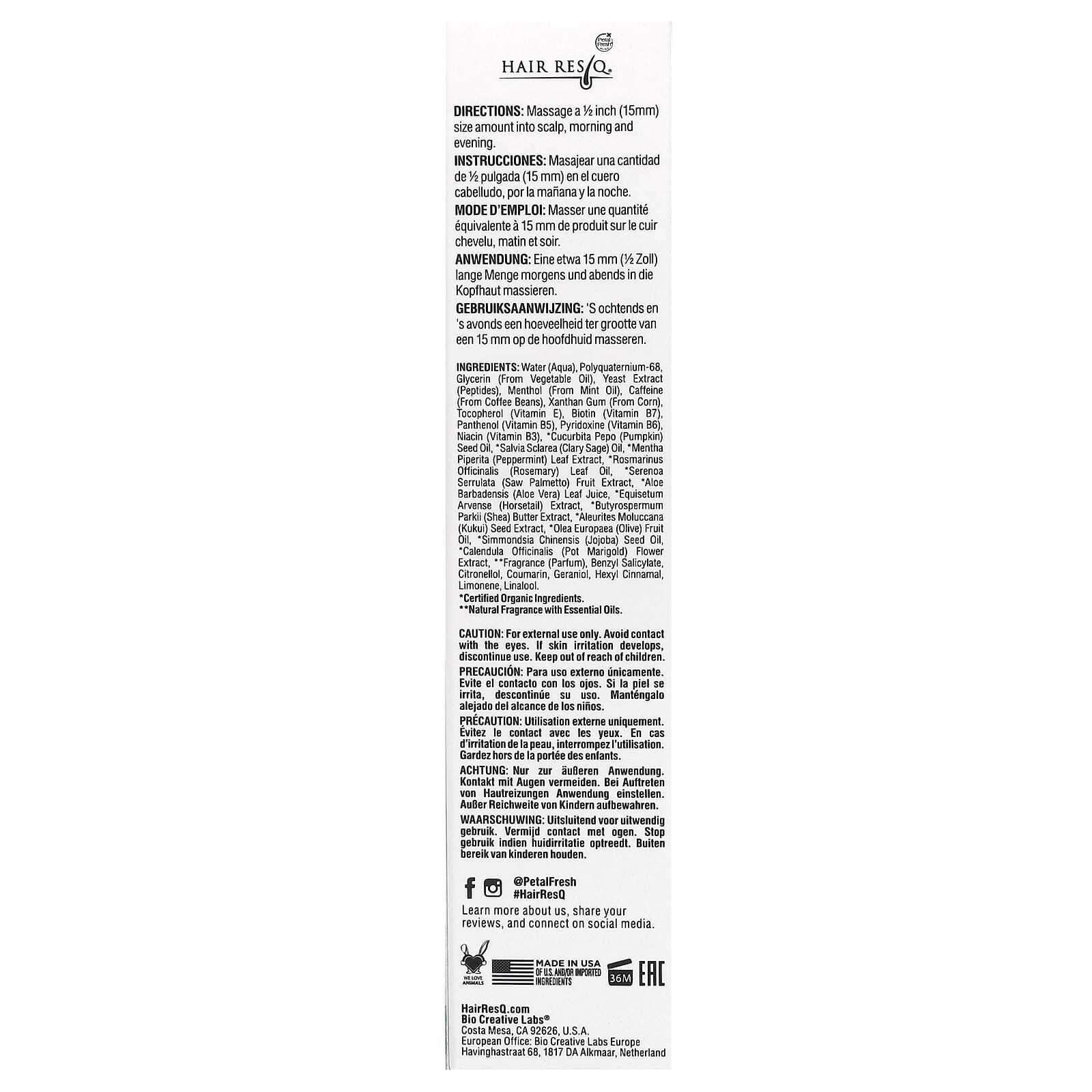 Вода, поликватерниум-68, глицерин (из растительного масла), экстракт дрожжей, ментол (из мятного масла), кофеин (из кофейных зерен), ксантановая камедь (из кукурузы), токоферол (витамин Е), биотин (biotin), пантенол (витамин B5), пиридоксин (витамин B6), ниацин (витамин B3), масло семян тыквы (Cucurbita pepo), масло шалфея (Salvia sclarea), экстракт листьев перечной мяты (Mentha piperita), масло из листьев розмарина (Rosmarinus officinalis)*, экстракт плодов серенои (Serenoa serrulata), сок листьев алоэ вера (Aloe barbadensis)*, экстракт хвоща полевого (Equisetum arvense)*, экстракт масла ши (Butyrospermum parkii), масло семян кукуи (Aleurites moluccana), оливковое масло (олива европейская), масло семян жожоба (Simmondsia chinensis)*, экстракт цветков календулы лекарственной (Calendula officinalis), ** аромат, бензилсалицилат, цитронеллол, кумарин, гераниола, гексил циннамал, лимонен, линалоола.