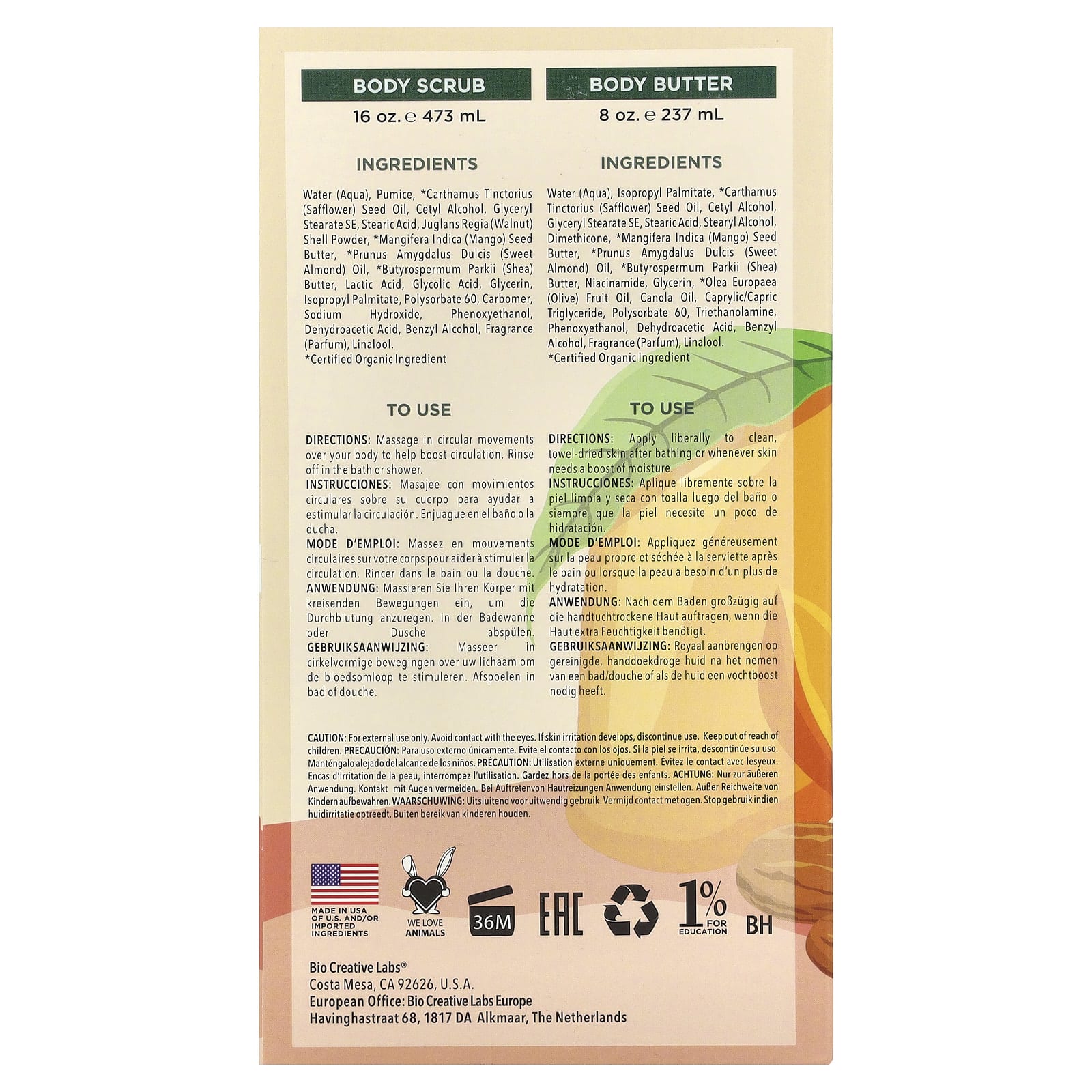 Скраб для тела: Вода (Aqua), пемза, масло семян сафлора (Carthamus tinctorius), цетиловый спирт, глицерил стеарат эмульгирующий, стеариновая кислота, порошок из скорлупы грецкого ореха (Juglans regia), масло из семян манго (Mangifera indica), масло сладкого миндаля (Prunus amygdalus dulcis), масло ши (Butyrospermum parkii), молочная кислота, гликолевая кислота, глицерин, изопропилпальмитат, полисорбат 60, карбомер, гидроксид натрия, феноксиэтанол, дегидроуксусная кислота, бензиловый спирт, отдушка (парфюмерная композиция), линалоола.