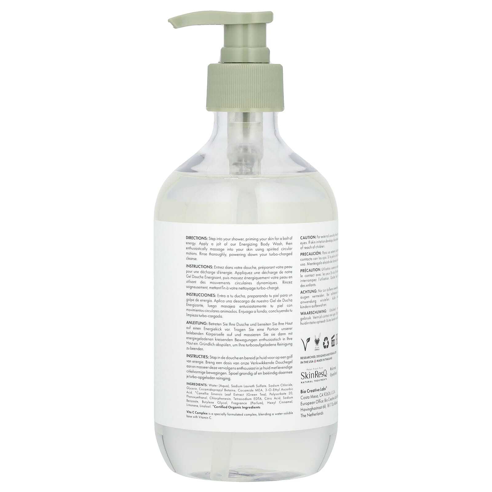 Вода, лауретсульфат натрия, хлорид натрия, глицерин, кокамидопропил бетаин, кокамид МЭА, 3-о-этил аскорбиновая кислота, * экстракт листьев зеленого чая (Camellia sinensis), полисорбат 20, феноксиэтанол, хлорфенезин, тетранатрий ЭДТА, лимонная кислота, бензоат натрия, бутиленгликоль, отдушка (парфюмерная композиция), гексил циннамал, лимонен, линалоол.