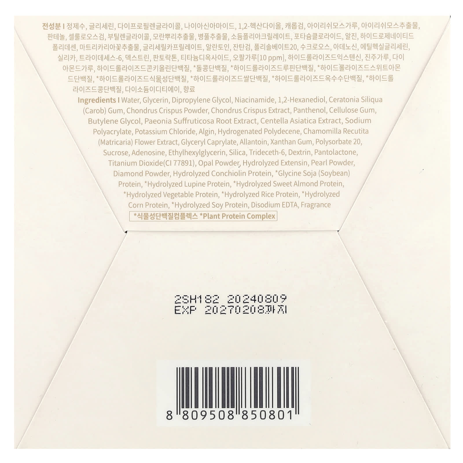 Вода, глицерин, дипропиленгликоль, никотинамид, 1,2-гександиол, камедь рожкового дерева (Ceratonia siliqua), порошок из ирландского мха (Chondrus crispus), экстракт ирландского мха (Chondrus crispus), пантенол, целлюлозная камедь, бутиленгликоль, экстракт корня пиона (Paeonia suffruticosa), экстракт готу колы (Centella asiatica), полиакрилат натрия, хлорид калия, альгин, гидрогенизированный полидецен, экстракт цветков ромашки лекарственной (Chamomilla recutita), глицерил каприлат, аллантоин, ксантановая камедь, полисорбат 20, сахароза, аденозин, этилгексилглицерин, диоксид кремния, тридецет-6, декстрин, пантолактон, диоксид титана (CI 77891), опаловый порошок, гидролизованный экстенсин, жемчужный порошок, алмазный порошок, гидролизованный белок конхиолин, * соевый белок (глицин), * гидролизованный белок люпина, * гидролизованный протеин сладкого миндаля, * гидролизованный растительный белок, * гидролизованный рисовый белок, * гидролизованный кукурузный белок, * гидролизованный соевый белок, двунатриевая ЭДТК, отдушка