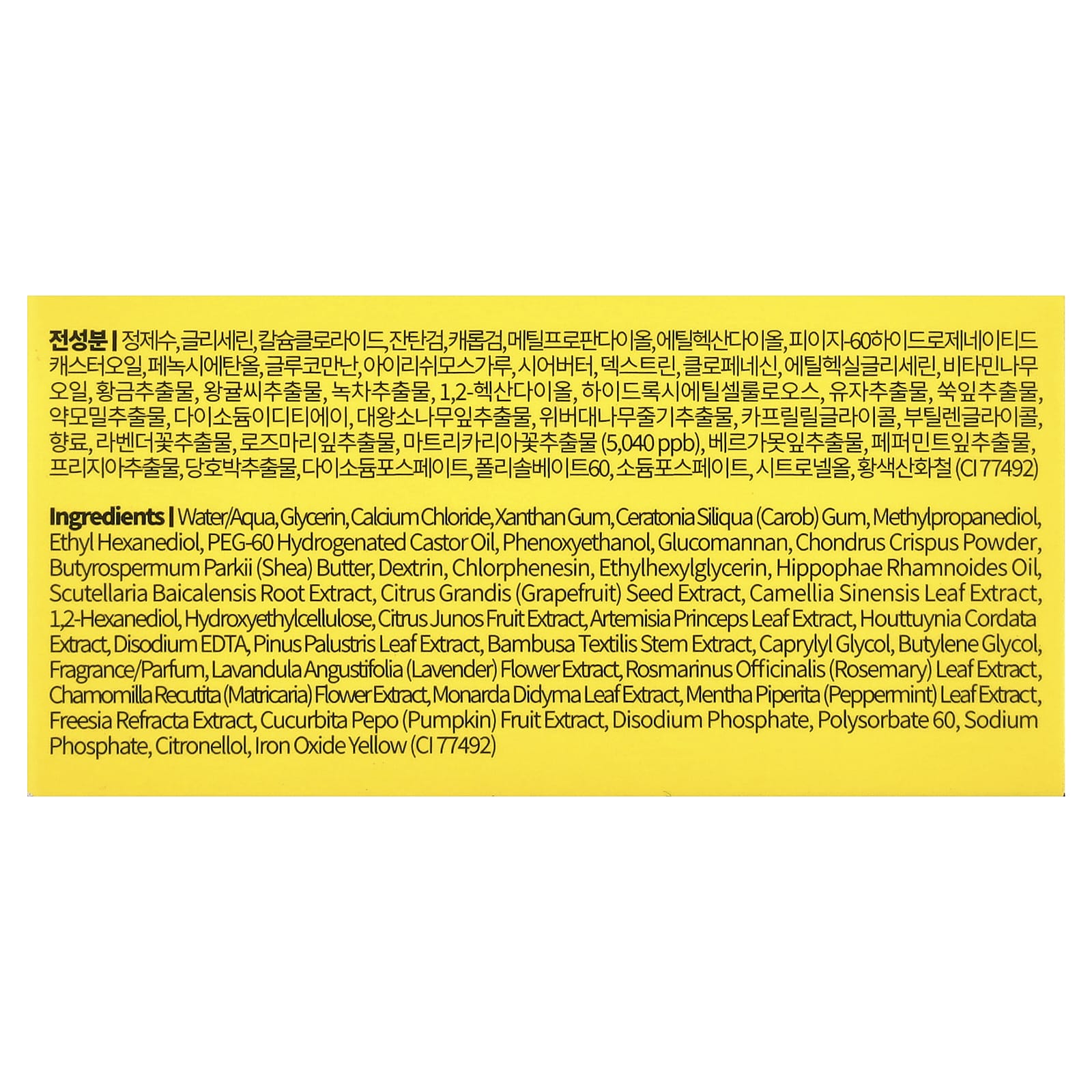Вода (Aqua), глицерин, хлорид кальция, ксантановая камедь, камедь рожкового дерева (Ceratonia siliqua), метилпропандиол, этил гександиол, ПЭГ-60 гидрогенизированное касторовое масло, феноксиэтанол, глюкоманнан, порошок из ирландского мха (Chondrus crispus), масло ши (Butyrospermum parkii), декстрин, хлорфенезин, этилгексилглицерин, масло облепихи крушиновидной (Hippophae rhamnoides), экстракт корня шлемника (Scutellaria baicalensis), экстракт семян грейпфрута (Citrus grandis), экстракт листьев зелёного чая (Camellia sinensis), 1,2-гександиол, гидроксиэтилцеллюлоза, экстракт плодов юдзу (Citrus junos), экстракт листьев полыни корейской (Artemisia princeps), экстракт хауттюйнии (Houttuynia cordata), двунатриевая ЭДТК, экстракт хвои сосны болотной (Pinus palustris), экстракт стеблей бамбука (Bambusa textilis), каприлилгликоль, бутиленгликоль, отдушка (парфюмерная композиция), экстракт цветков лаванды (Lavandula angustifolia), экстракт листьев розмарина (Rosmarinus officinalis), экстракт цветков ромашки лекарственной (Chamomilla recutita), экстракт листьев монарды двойчатой (Monarda didyma), экстракт листьев перечной мяты (Mentha piperita), экстракт фрезии (Feesia refracta), экстракт плодов тыквы (Cucurbita pepo), динатрия фосфат, полисорбат 60, фосфат натрия, цитронеллола, оксид железа желтый (CI 77492).
